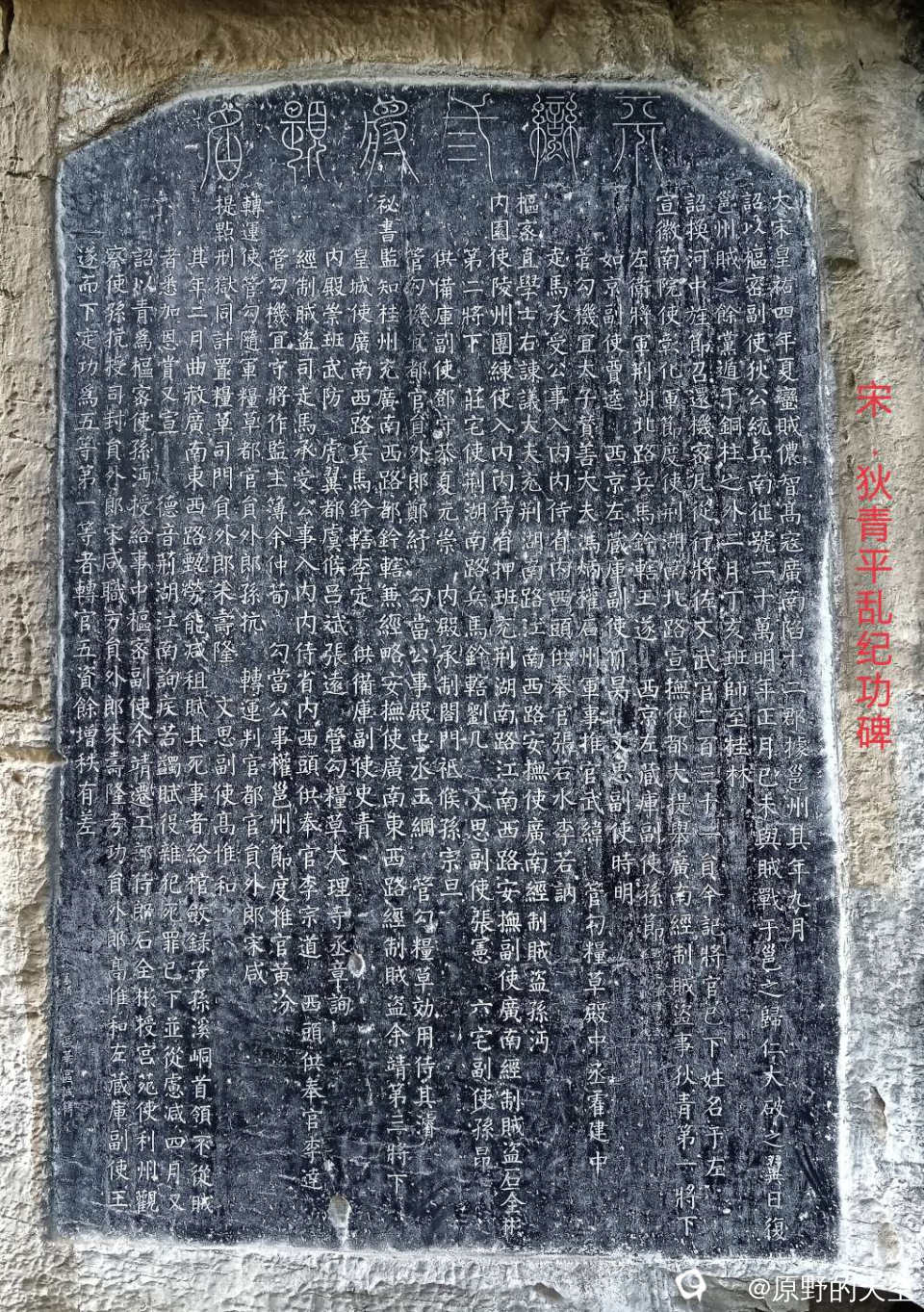 这是平定地方叛逆取得胜利的纪功碑。北宋皇佑四年,广西壮族首领侬智高起兵造反,向广东进发,连克九州,广州城危。朝廷派狄青前往弹压,侬智高大败出逃,狄青班师返京途经桂林,将平定判军的有功将士三十七人名单刻于龙隐岩石壁之上。