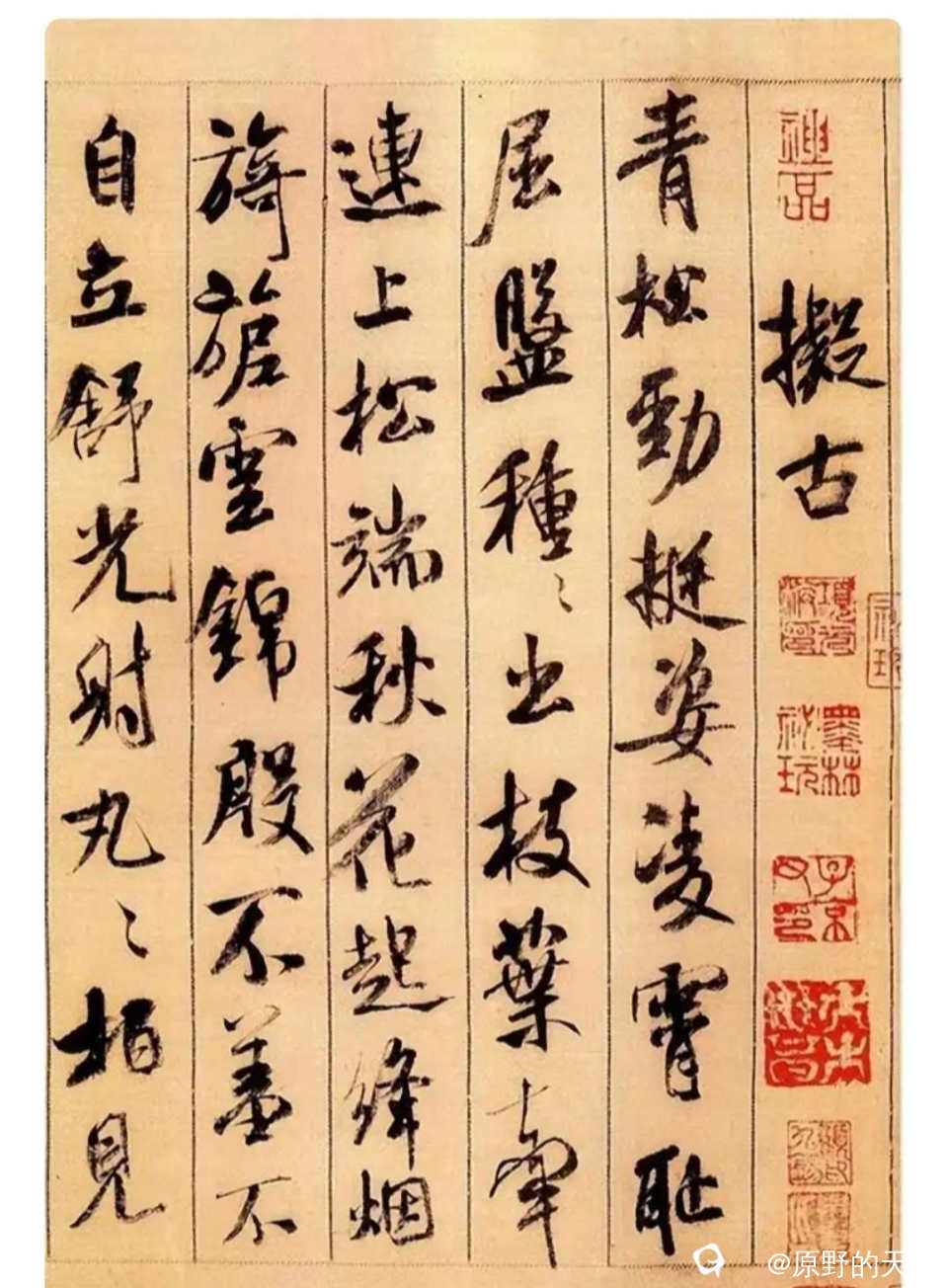 黄庭坚的行书“五君咏”。内容是对晋朝“竹林七贤”中的五贤(阮籍、嵇康、刘伶、阮咸、向秀)的赞颂。