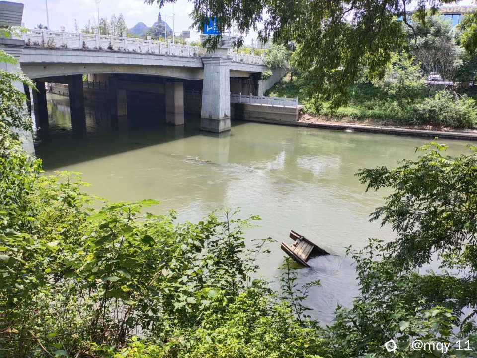 2025年的秋老虎,已经悄悄然的来了,白天的热度,让桂林这座城市披上了热浪。而位于桂林穿山公园门口的新桥旁,一艘小木船,不知道什么原因,一头扎进了这东江水“洗澡”,一头翘起了个屁股“晒太阳”。