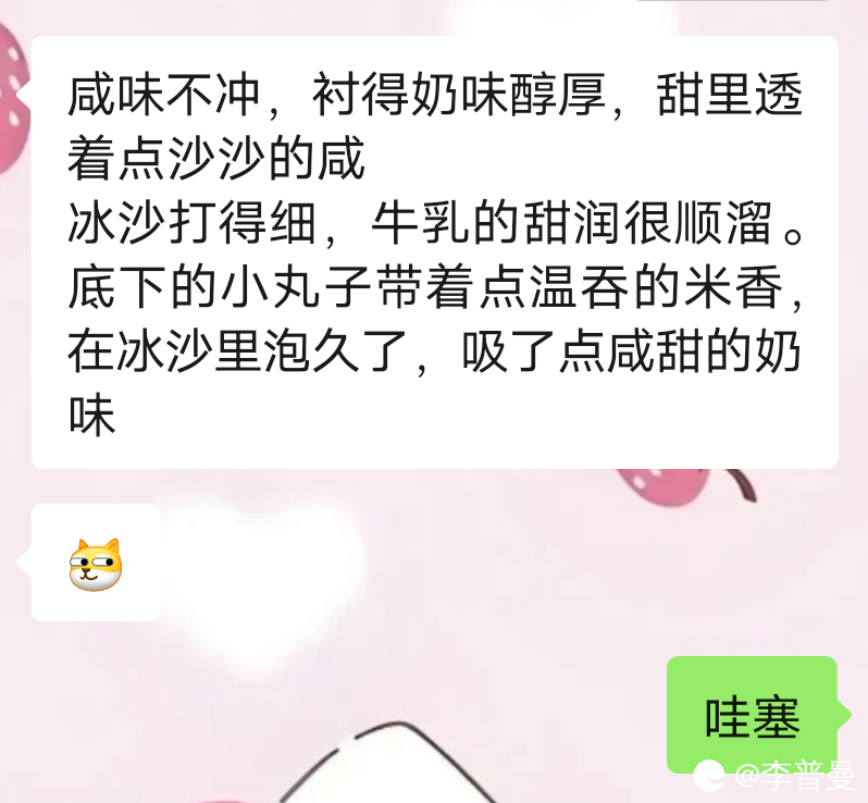 断扰梦忧(男):咸味不冲。衬得奶味醇厚。甜里透着点沙沙的咸。冰沙打得细。牛乳的甜润很顺溜。底下的小丸子带着点温吞的米香。在冰沙里泡久了。吸了点咸甜的奶味。