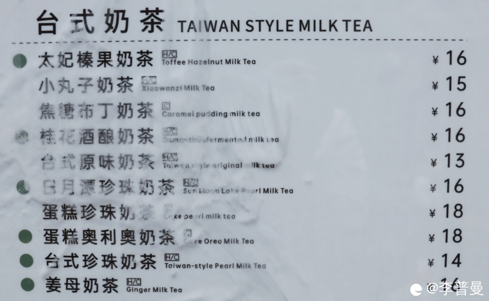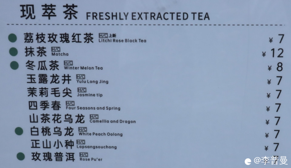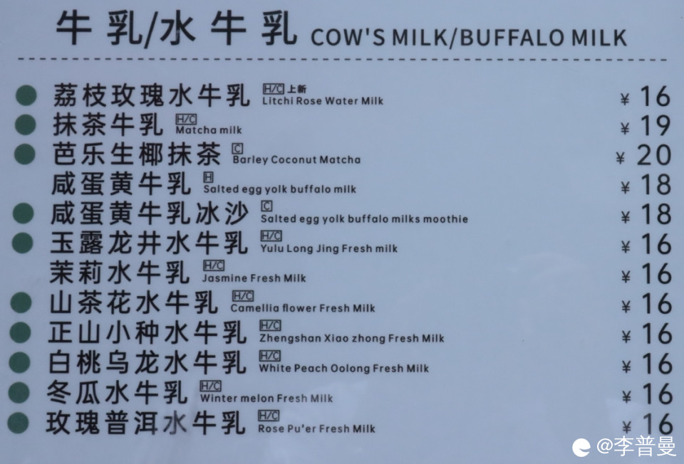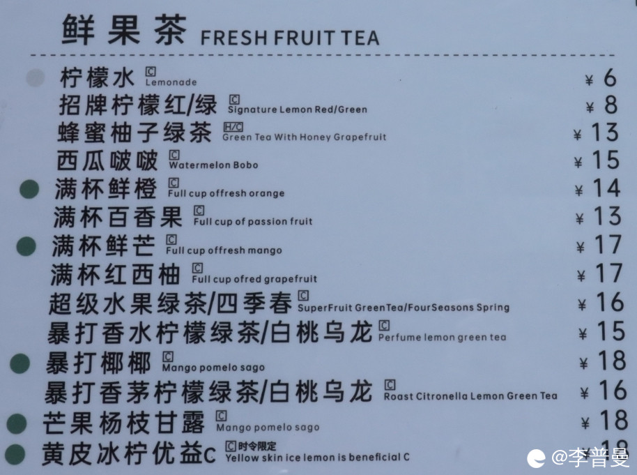 鲜果茶主打清爽口味。价格在6-18元。黄皮果冰柠优益C紧跟时令。牛乳/水牛乳主打颜值门面。价格在16-20元。热销系列咸蛋黄牛乳冰沙等在其中。台式奶茶主打经典系列。价格在14-18元。姜母奶茶奶茶热饮适合冬天饮用。现萃茶主打养生功效。价格7-12元。茉莉毛尖绿茶清肠刮胃。