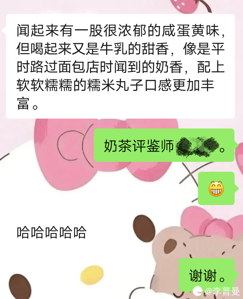 P(女):闻起来有一股很浓郁的咸蛋黄味。但喝起来又是牛乳的甜香。像是平时路过面包店时闻到的奶香。配上软软糯糯的糯米丸子口感更加丰富。
