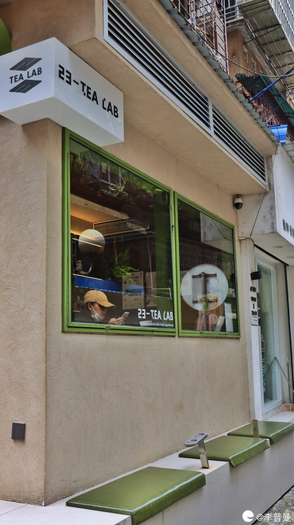 店铺装修风格是复古绿色。正门左边是出餐口。右边是室外座椅。进门是点餐口。出餐口贴有饮品单和下单小程序二维码。客桌桌面出现碎屑诸多。晚班奶茶师清洁工作不到位。室外座椅搭配绿相框玻璃窗。非常适合进行网红感系列拍照打卡