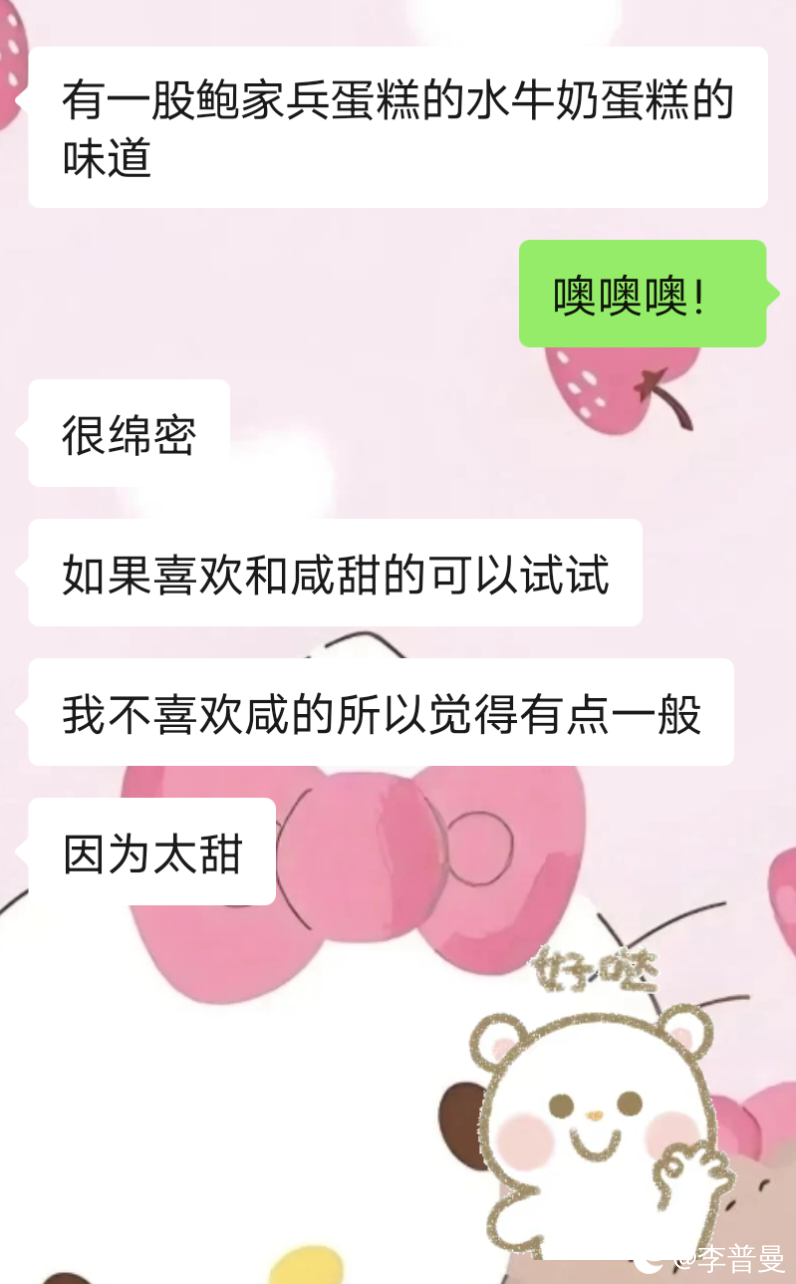 纪三儿(女):有一股鲍家兵蛋糕的水牛奶蛋糕的味道。很绵密。如果喜欢喝咸甜的可以试试。我不喜欢咸的所以觉得有点一般。因为太甜。又有点咸。还有一股肉松味。