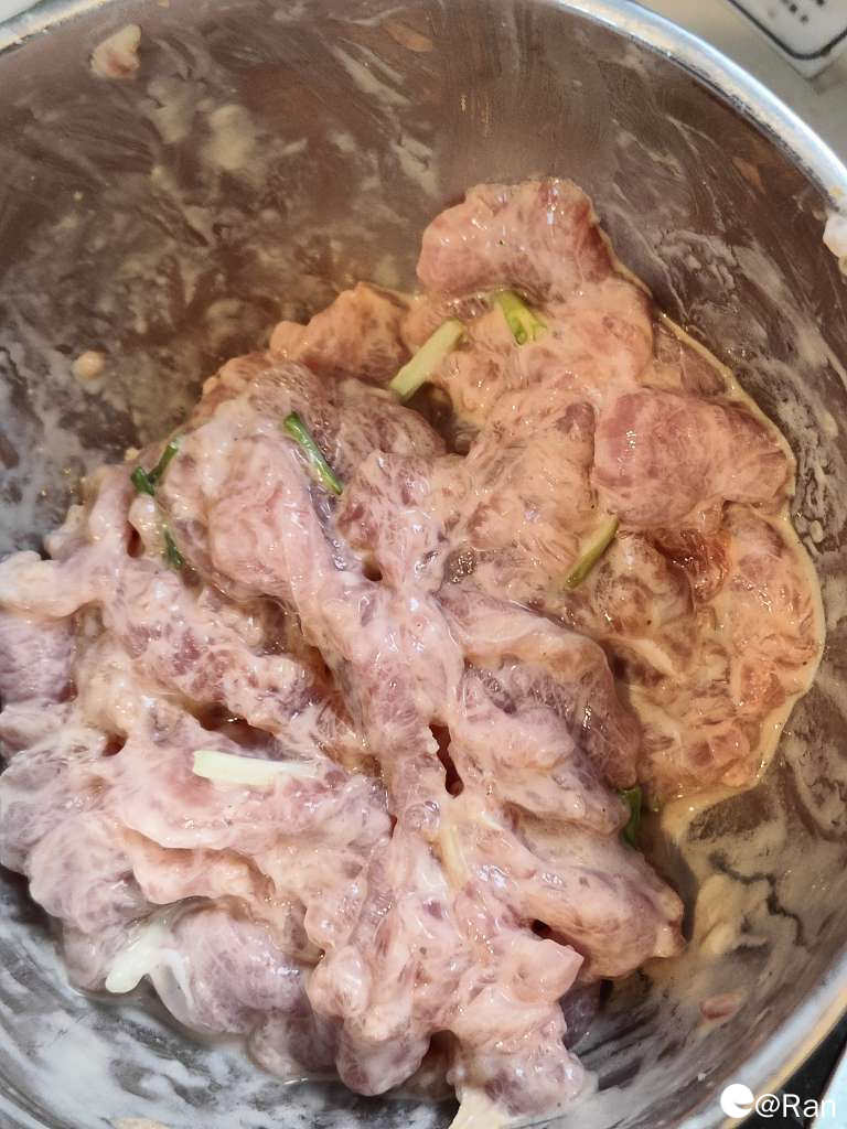 1.将瘦肉切成薄片,把上述材料放进去搅拌均匀,静置十分钟