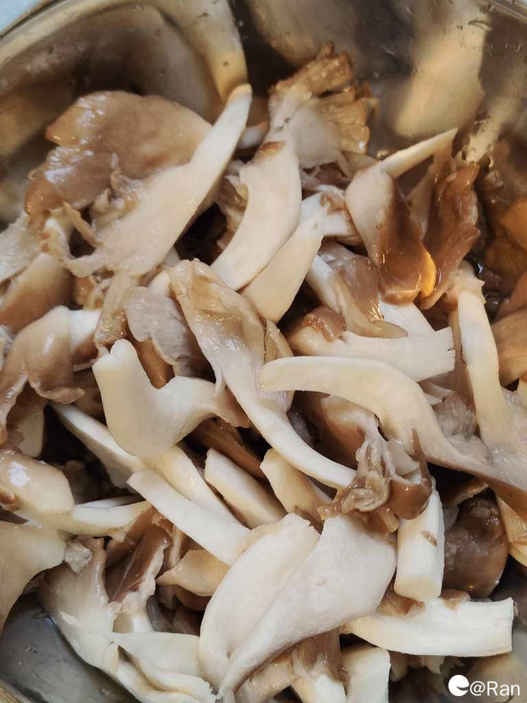 2.平菇加点盐杀出水分,洗净后下锅炒两分钟