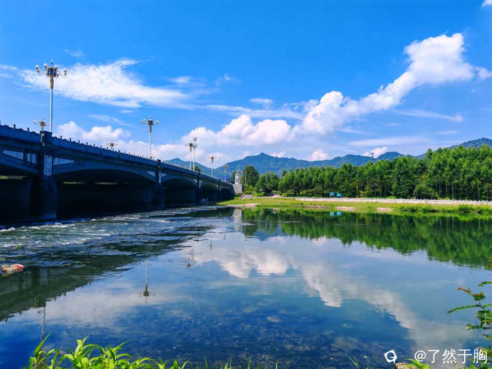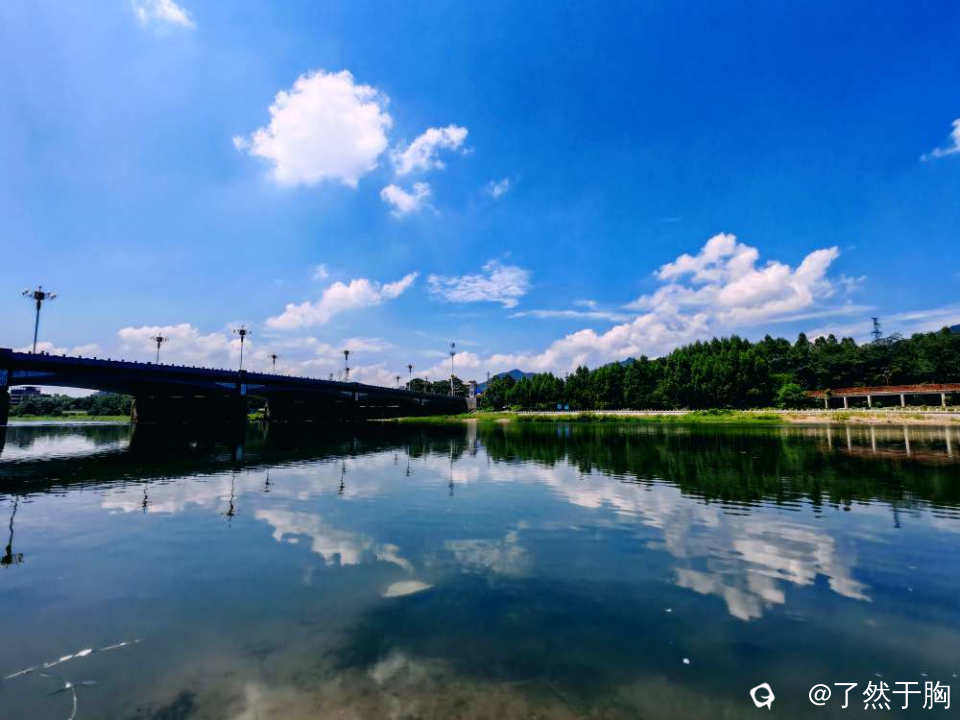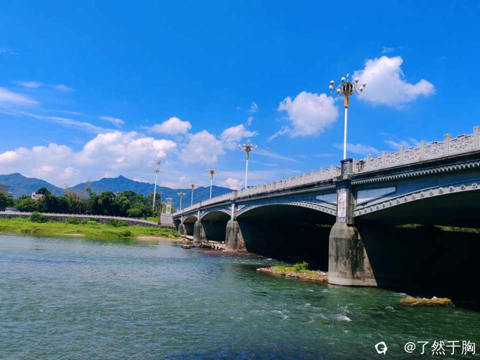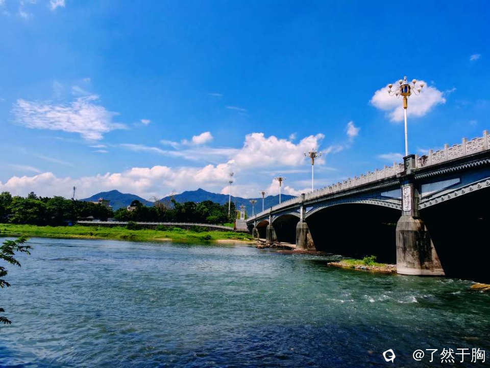 在甘棠江公园里的甘棠江三桥上下游观赏,但见青山绿水,蓝天白云,桥梁路灯,上下天光,浑然一体,映入眼帘的是一幅幅变幻多姿,各具特色的图画。