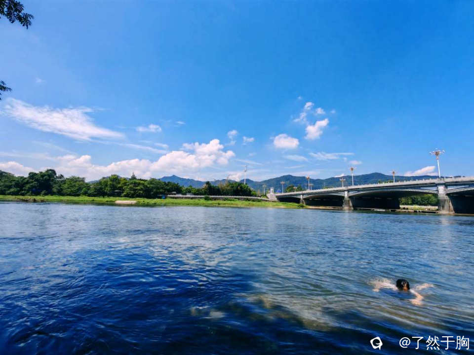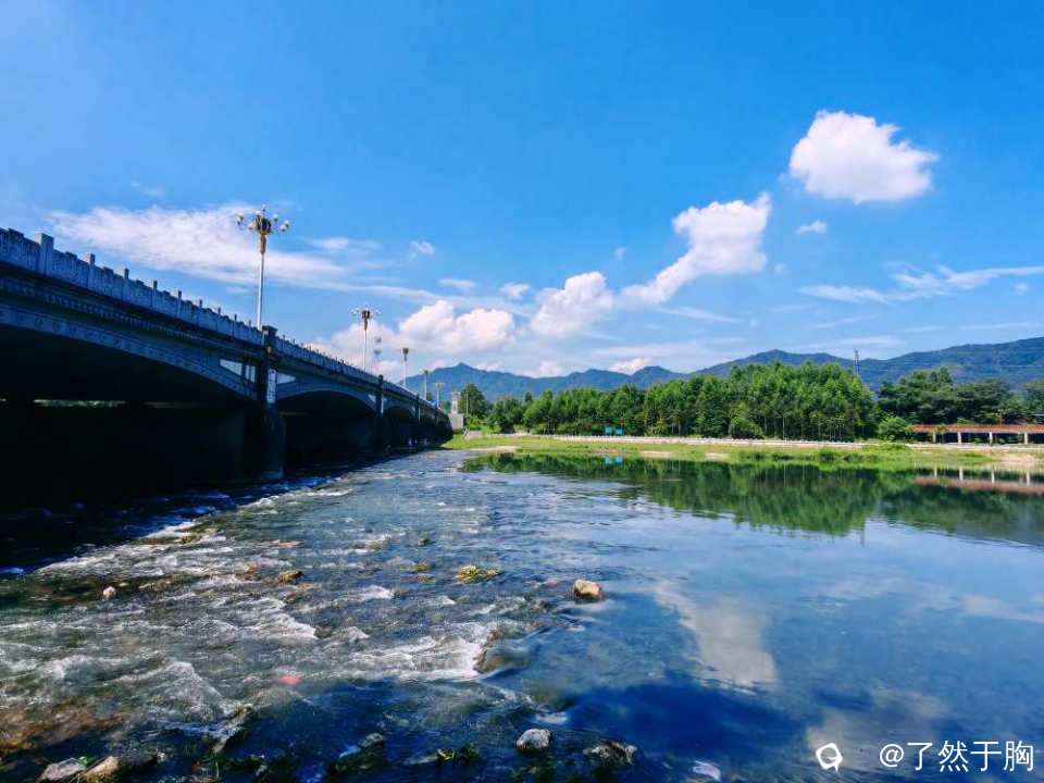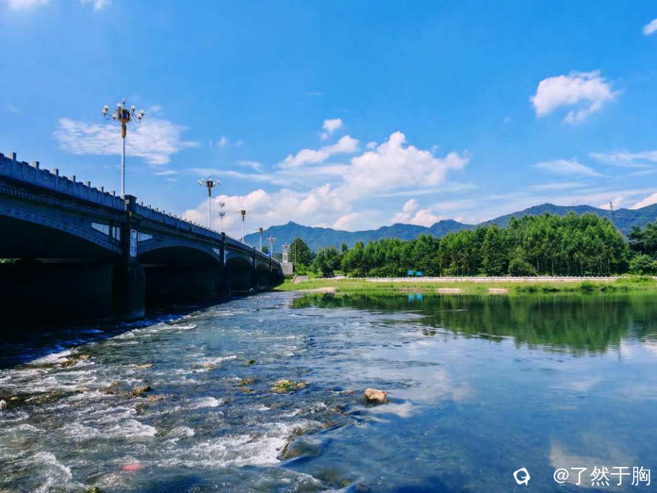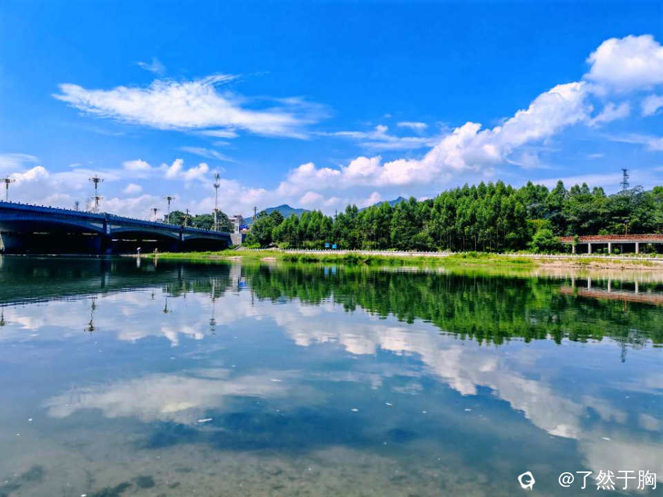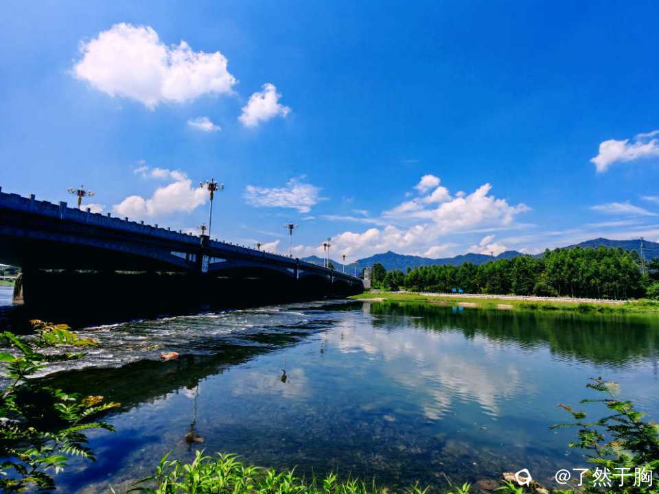 在甘棠江公园里的甘棠江三桥上下游观赏,但见青山绿水,蓝天白云,桥梁路灯,上下天光,浑然一体,映入眼帘的是一幅幅变幻多姿,各具特色的图画。