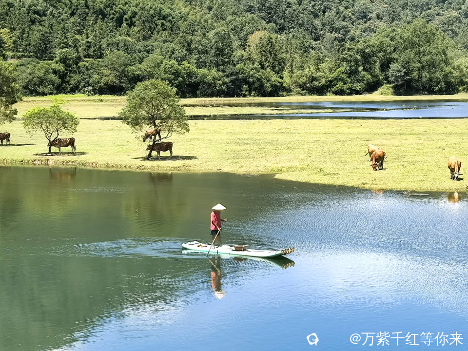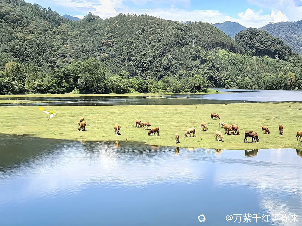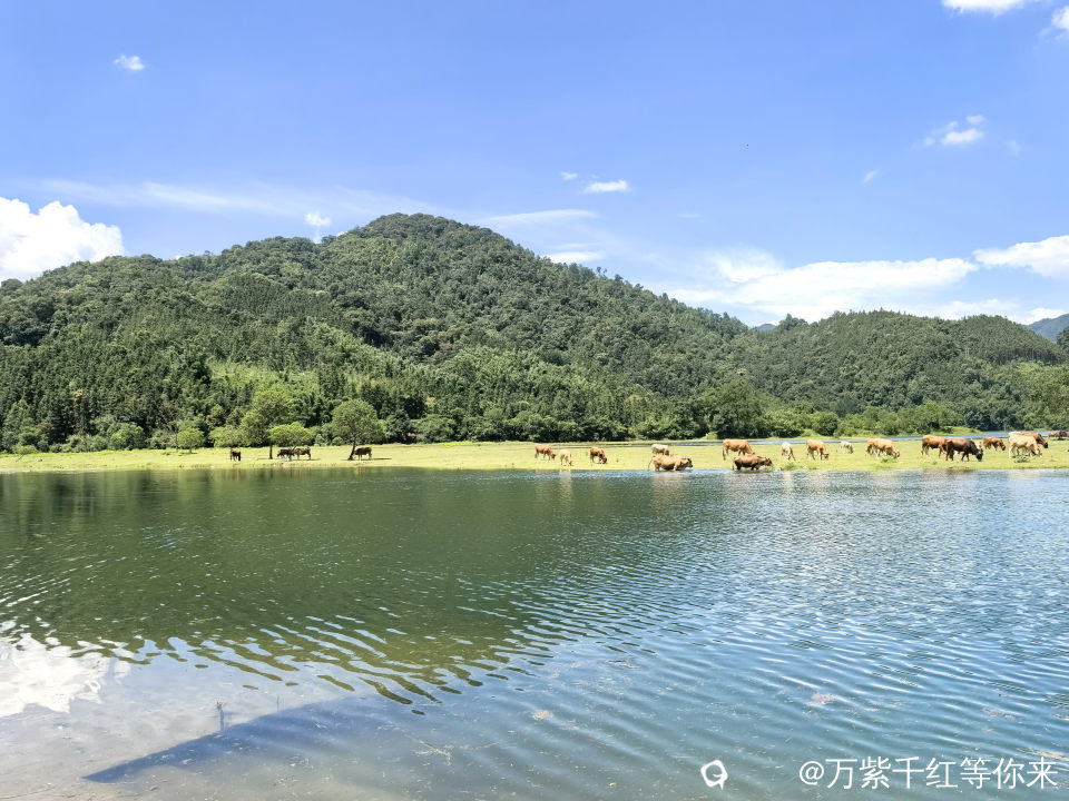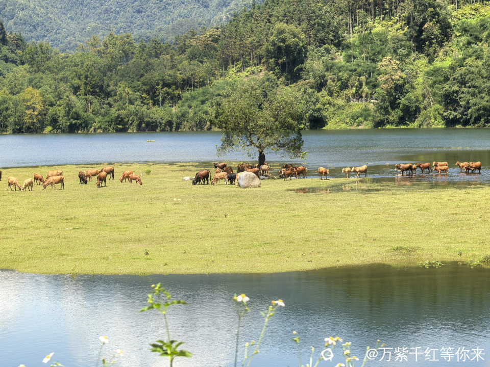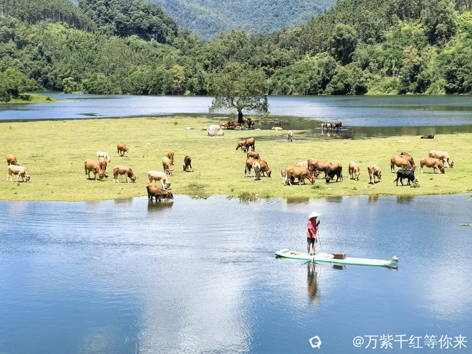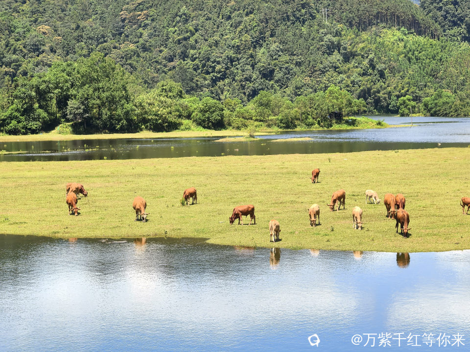 河对面一片绿油油的草地铺在我眼前,十几头牛群闲散在草地上,低着头慢悠悠的啃草:时不时发出哼哼的叫声,或时不时甩一下尾巴,模样惬意得让人羡慕。