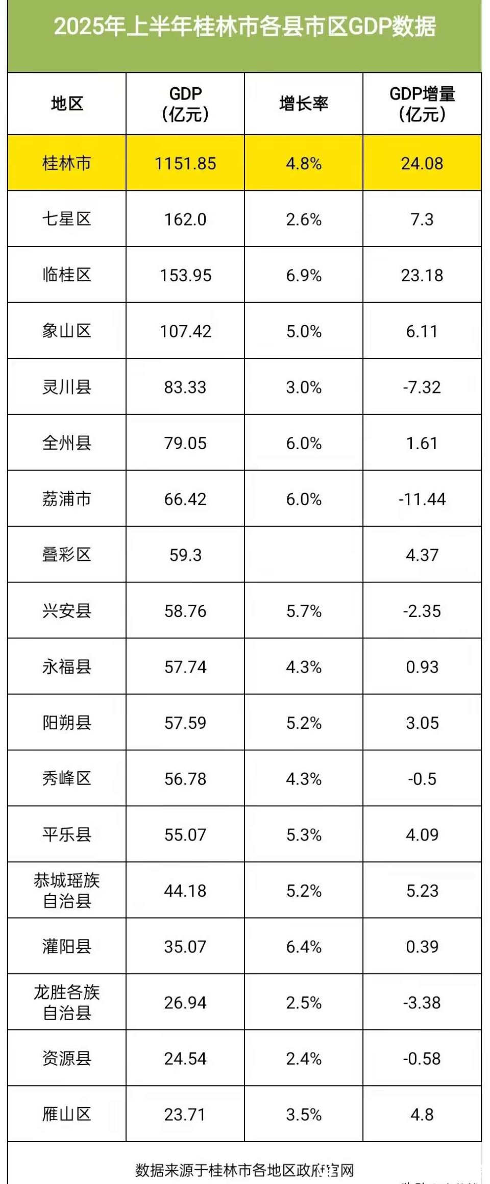 桂林市2025年上半年各县