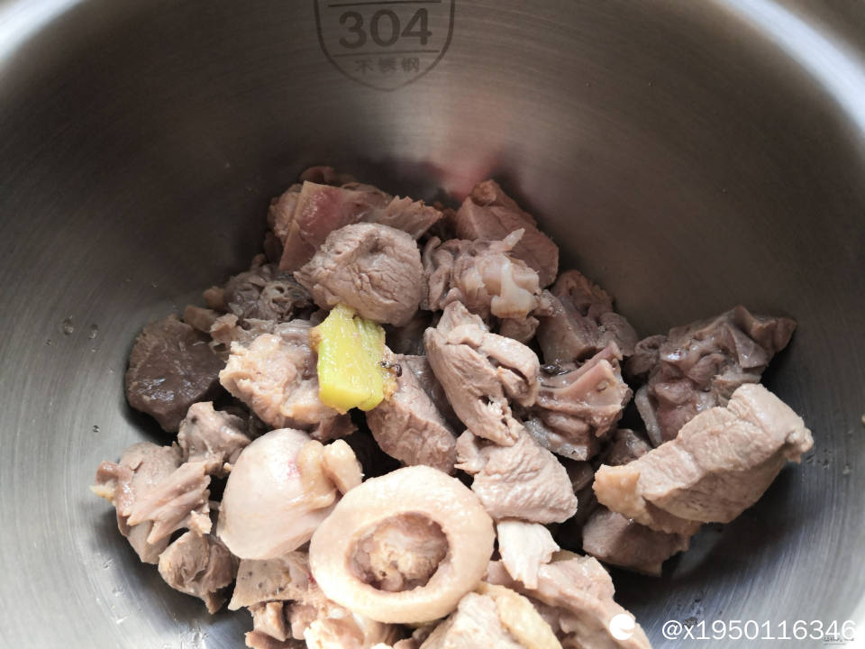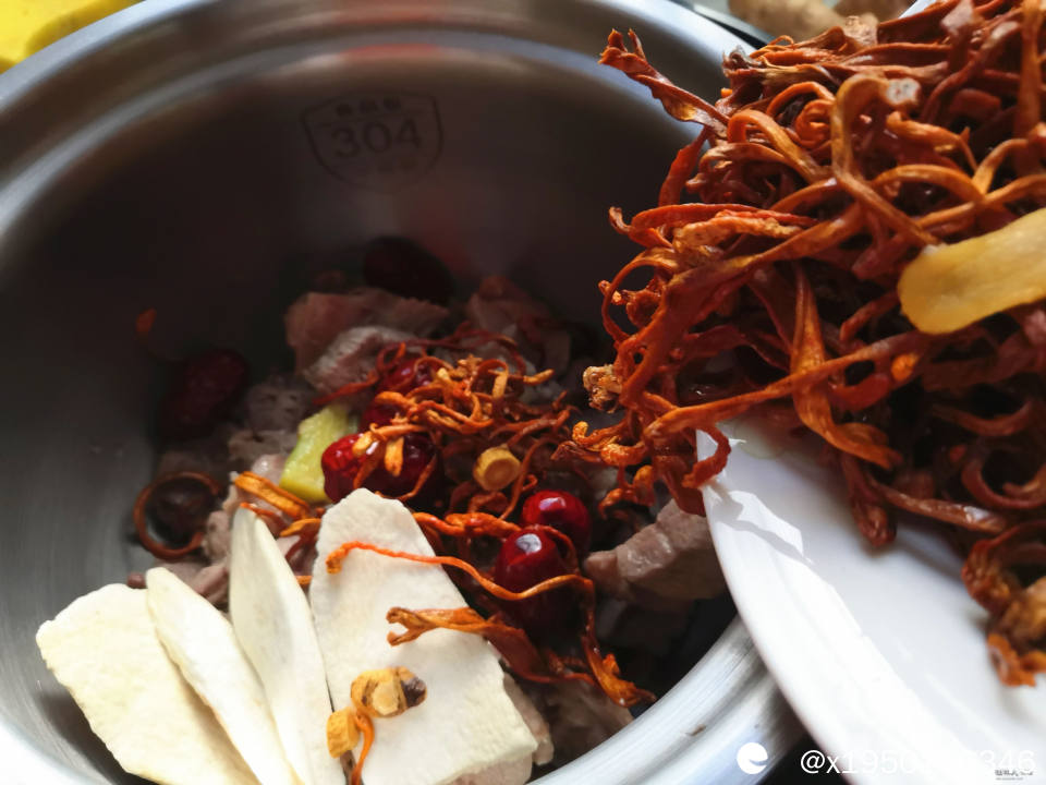 4·  焯水后的老鸭放入煲汤锅内,再倒入清洗干净的虫草花等配料。