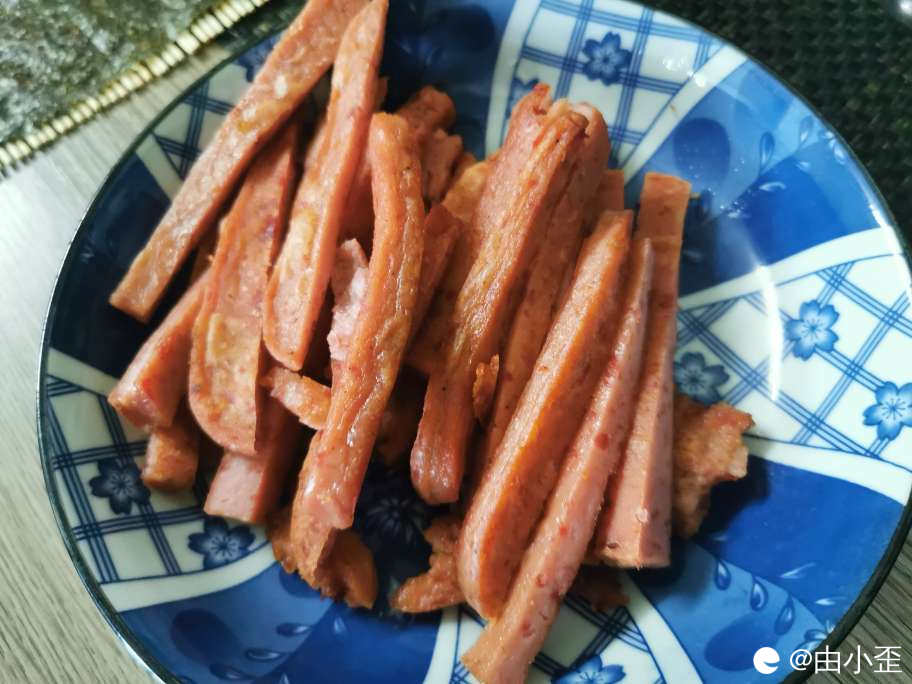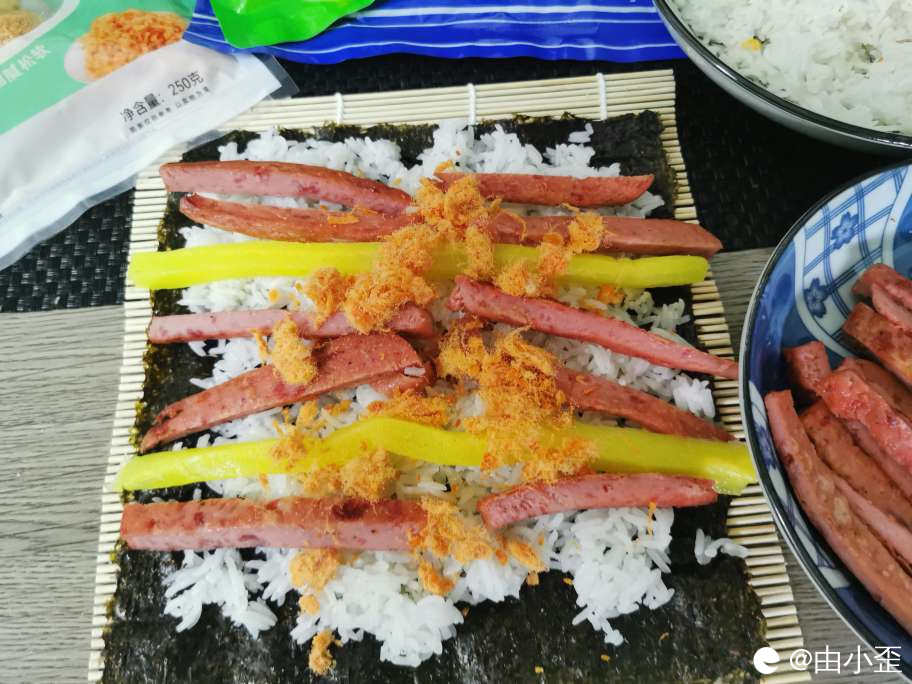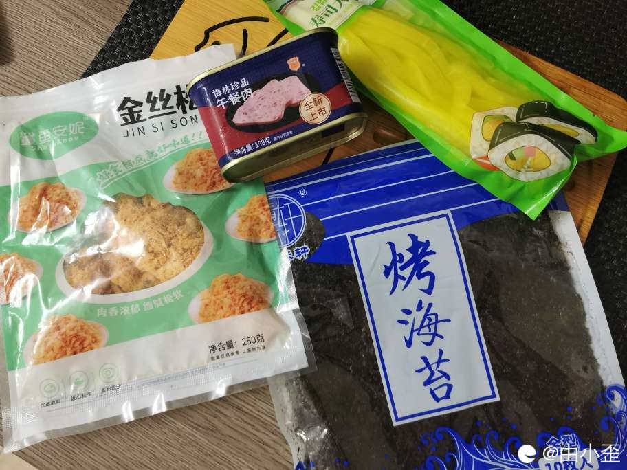 在等待的期间,准备好了肉松、烤海苔、午餐肉、寿司大根条。