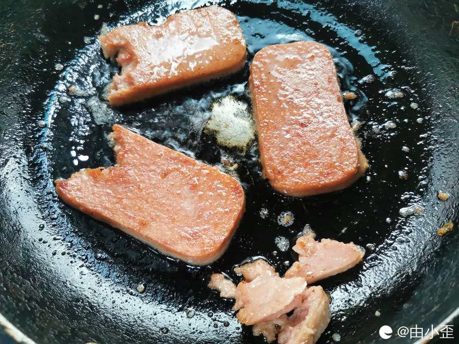 把午餐肉均匀切片,温锅小火慢煎。