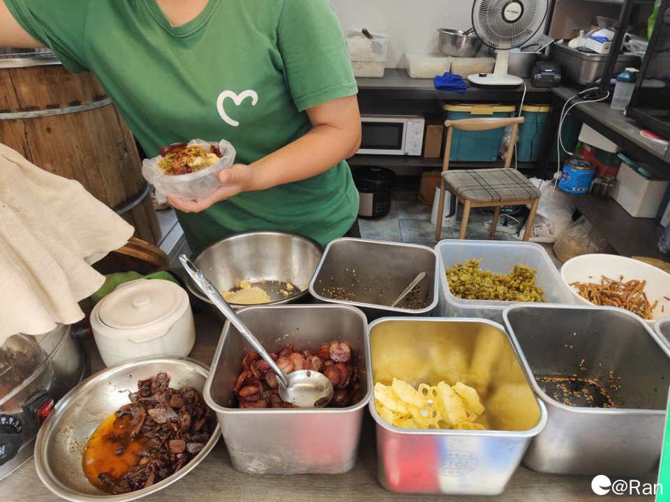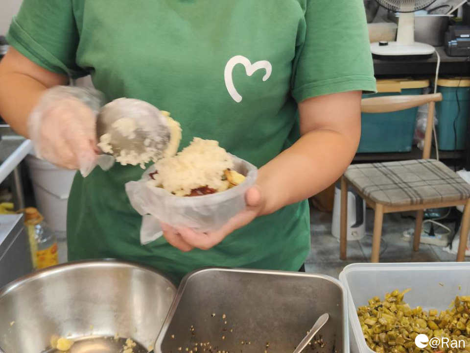我点了一份经典款糯米饭,阿姨面前摆了好多小料,豆蓉、腊肠、脆脆、豆角,每种都加了一点,感觉小料快溢出来了。