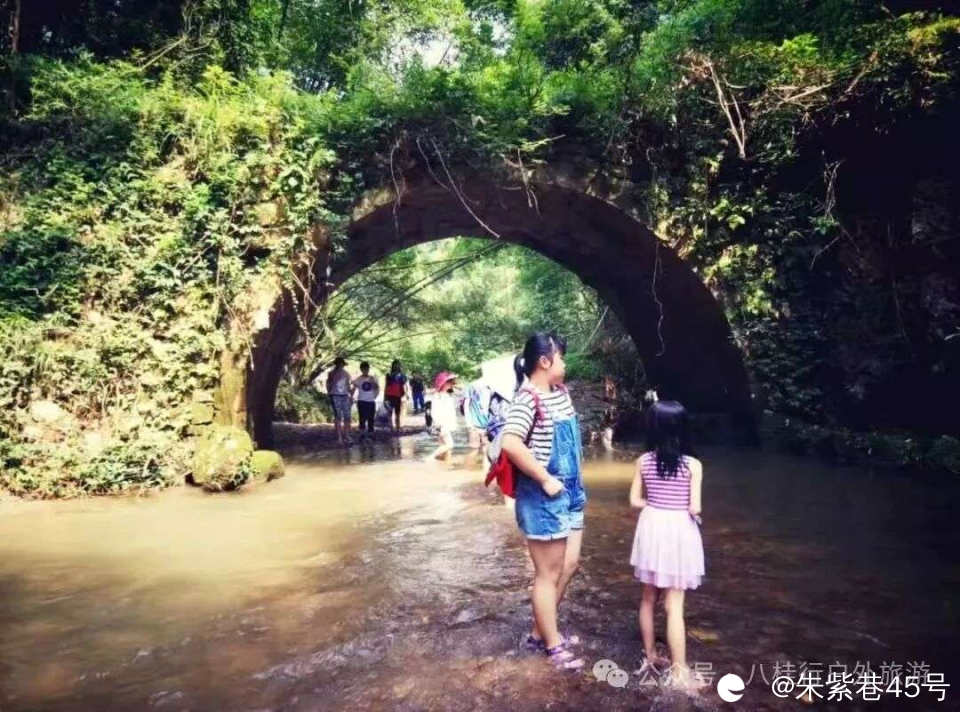 【活动内容】:古道、徒步,摄影。小河里是河伯源村一个山坳名称,里面贯穿着一条小河,这条小河上游是在灵川潮田南墟潜入地下,潜流7公里,流经灵川、阳朔、雁山三地,其间有多个竖井、天窗与地表沟通。特别是在阳堤牛屎冲的地下溶潭间,以反虹吸的管道连接,落差深达70余米,全程充水,1985年中英联合洞穴探险队曾经对此涵洞进行了调查,未果而归。 地下河在此露出地面的一小段,溪水从一个山洞流出,明流500多米后,重又潜入地下,至草坪的安吉岩、冠岩出口注入漓江。造物主在这里揭开地下河的面纱,让我等能一窥芳容。