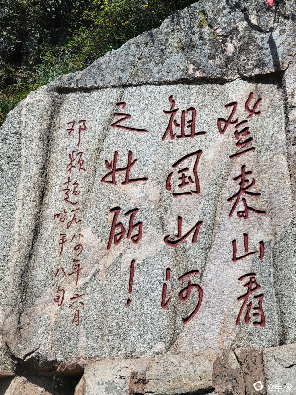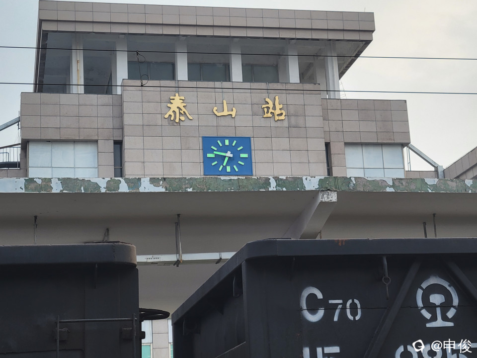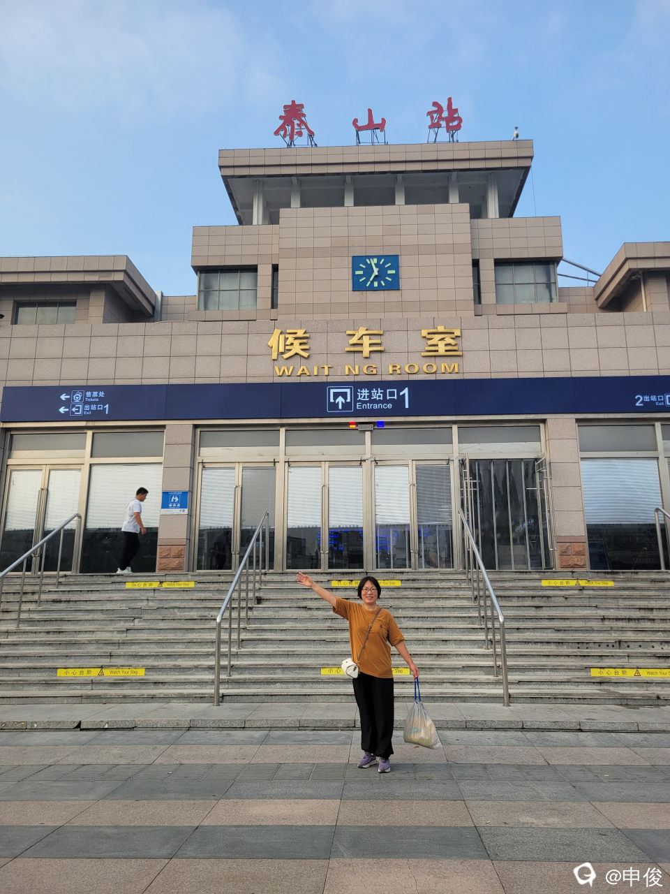 第一次在火车上看日出:对面窗外雾蒙蒙的天空中见到中上方有一片红晕不知过了多久,偶然一抬头,漂亮的红彤彤圆挂出来啦[哇],只一会儿,山挡住了它我便耐心等着,果然,绿皮火车慢得好,更大一点的红太阳有了一点光芒[太阳]又被连山遮住了,山也有了金边[让我看看][鼓掌][鼓掌]就听乘务员在喊:泰山到了!