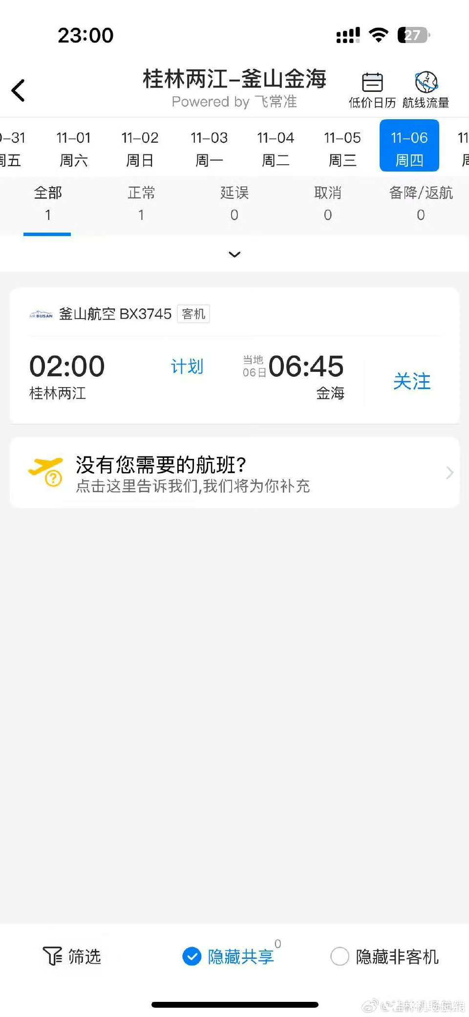 这是旅游包机,主要服务韩国游客的,桂林这点散客不够人家航司塞牙缝。时间只能是半夜。