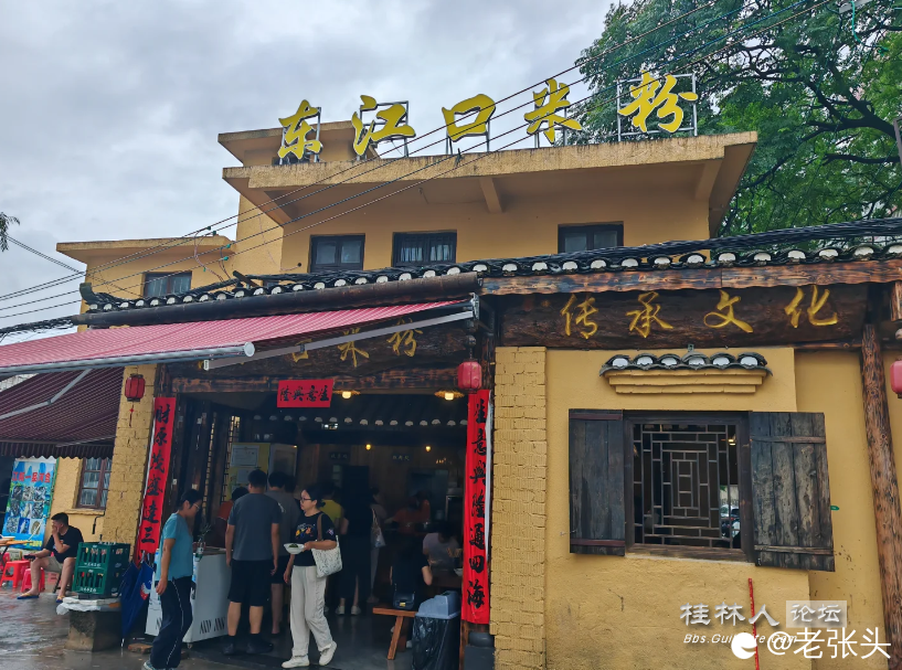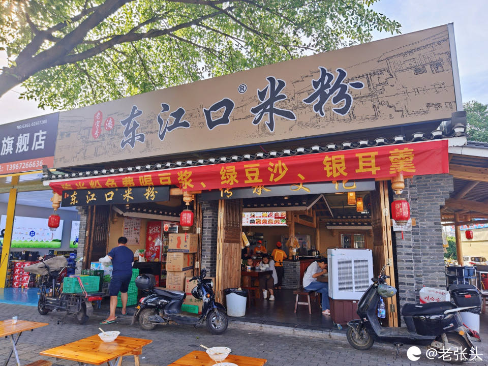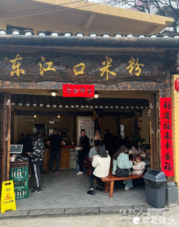 不过在净瓶山附近,这里虽已远离小东江,但也有一家东江口米粉,店内装修还和某郡府的风格很像。但仔细一看,照片上有个小小的红点,红点里面有个漓字,东江口变成漓东江口了?