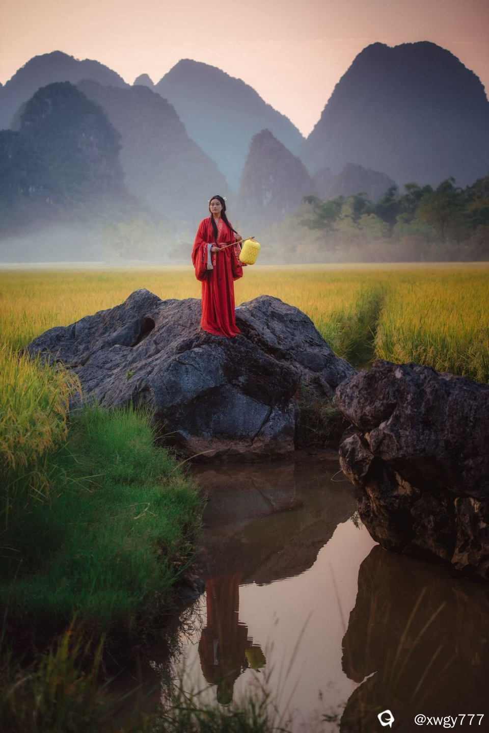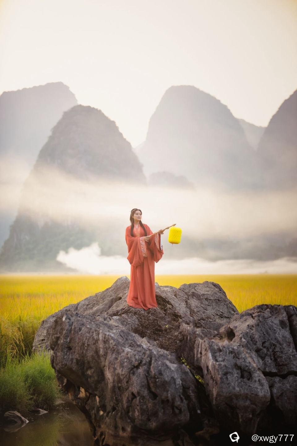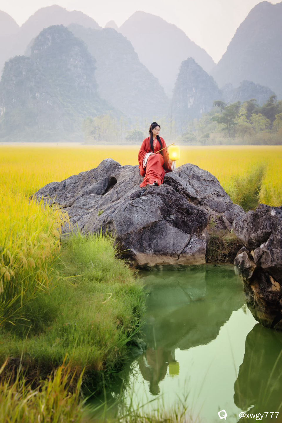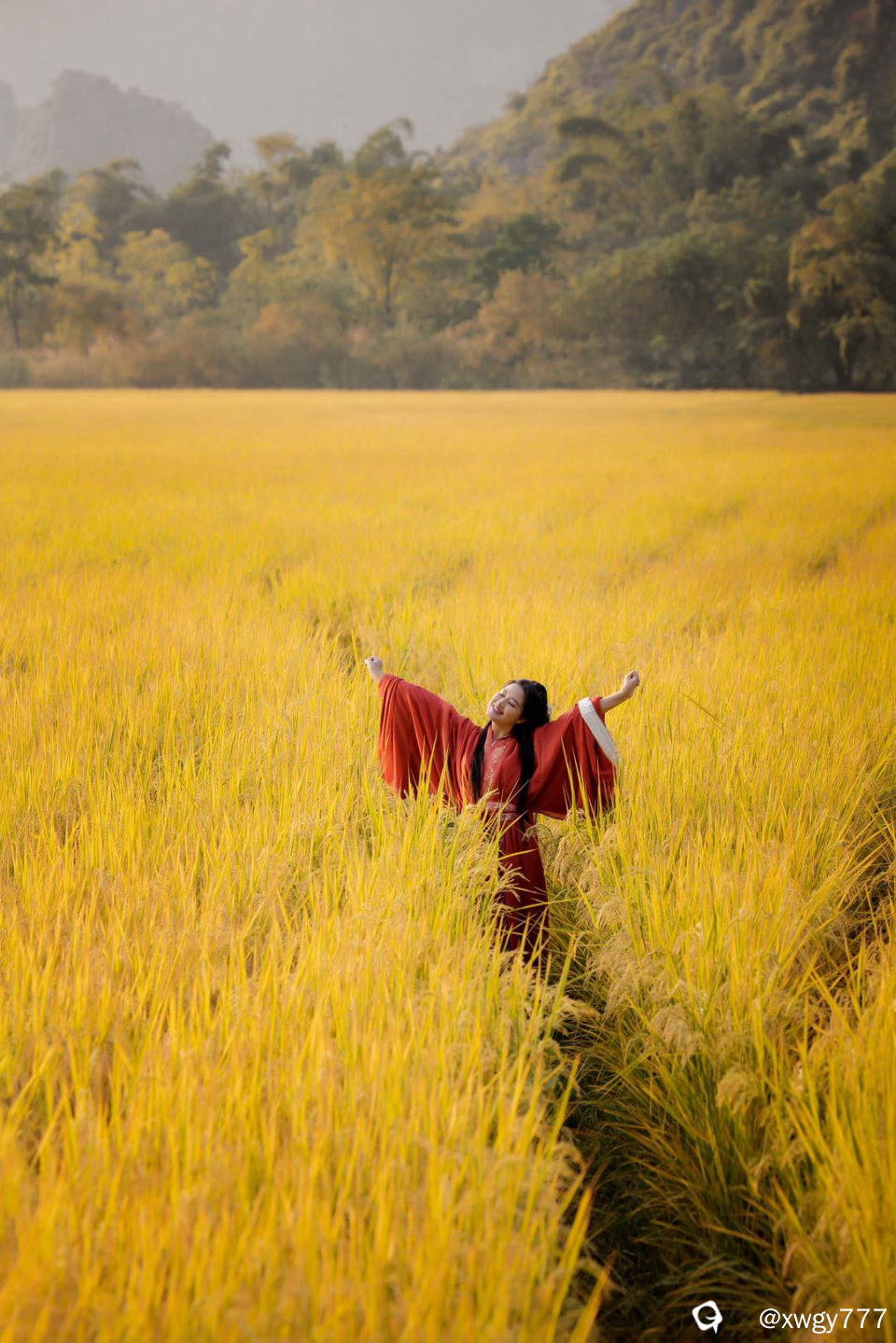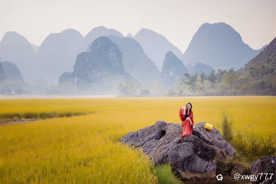 2024年十月拍的一组战国袍,原本是想拍状元桥日出的,谁知道那天刚好遇到临桂区在拍状元桥的宣传片,一直没机会上桥,就在旁边的稻田上拍起了,没想到这个大石头今年火了,还有了一个非常美丽的名字:禾韵田园