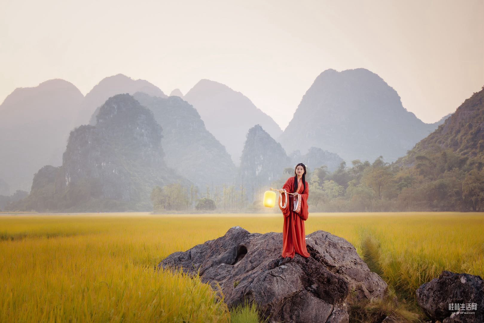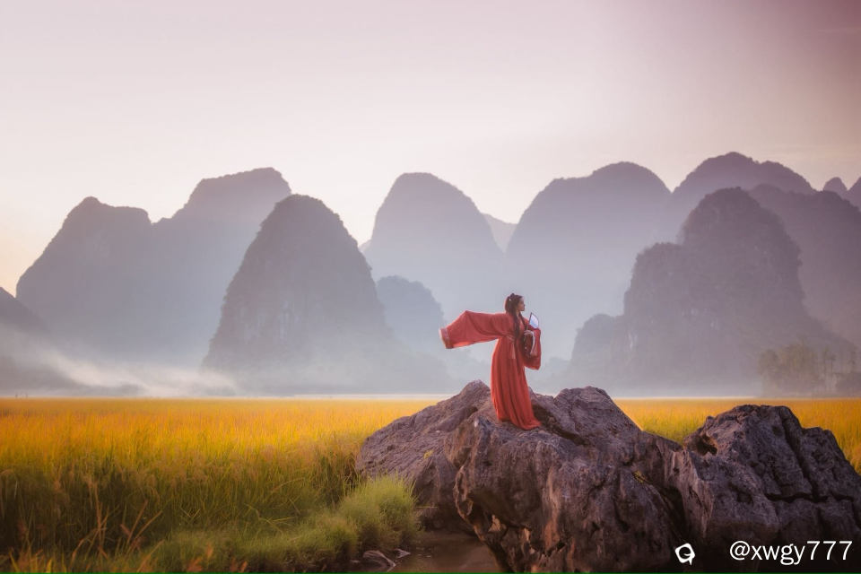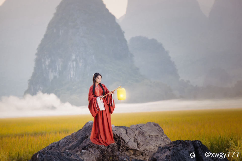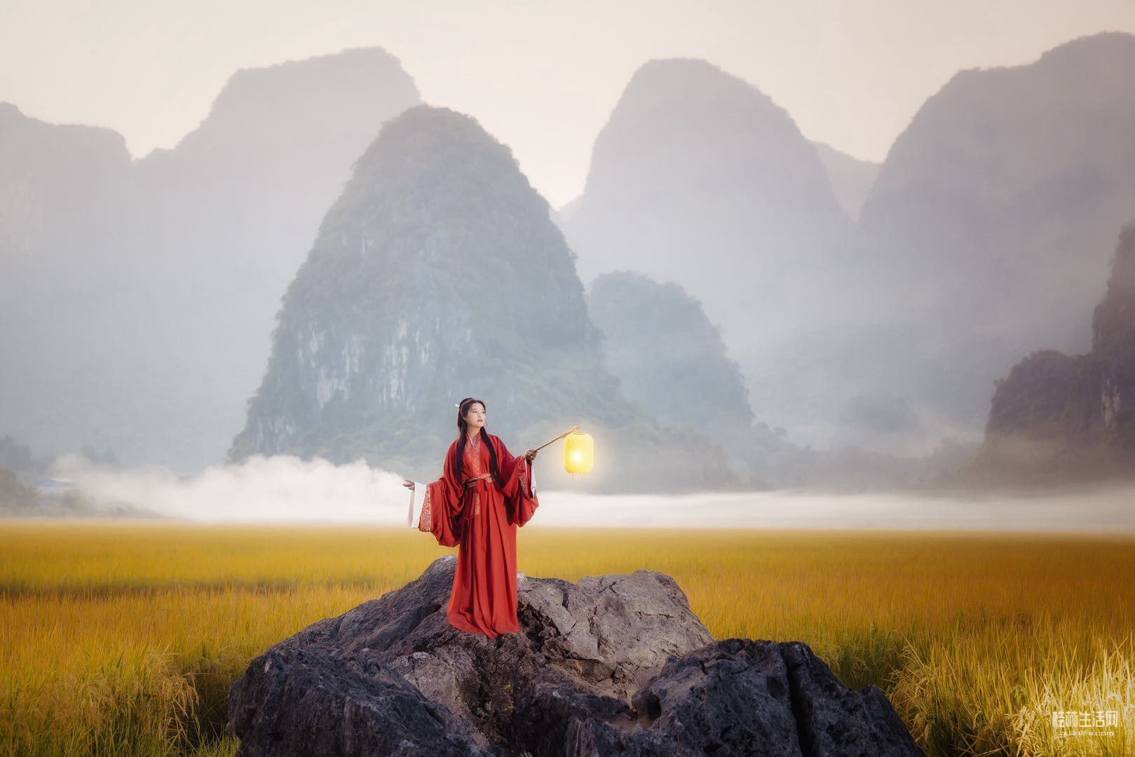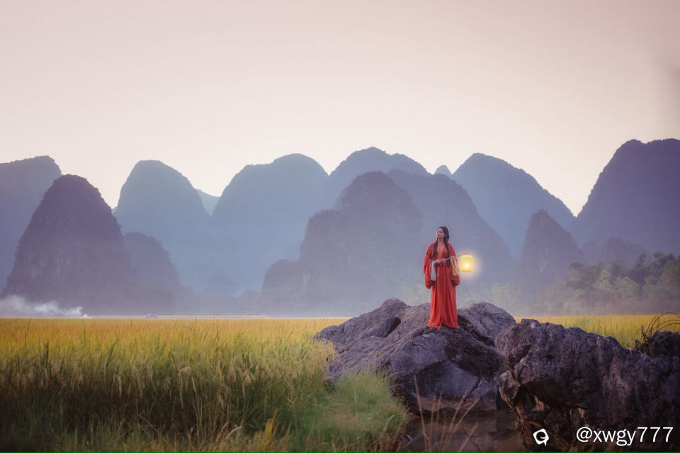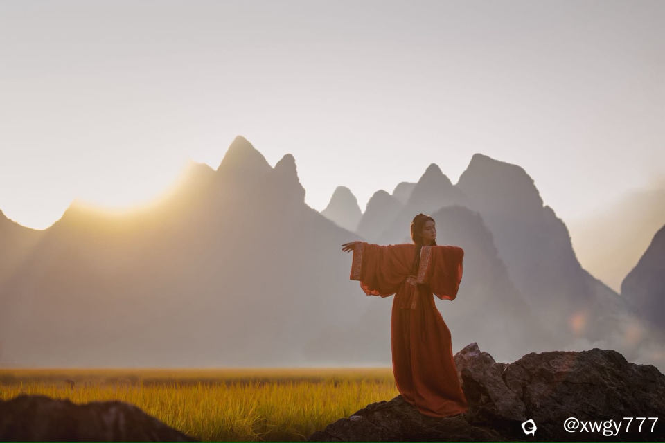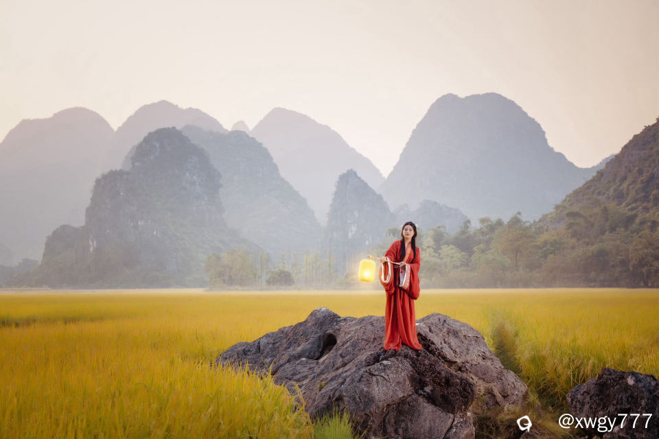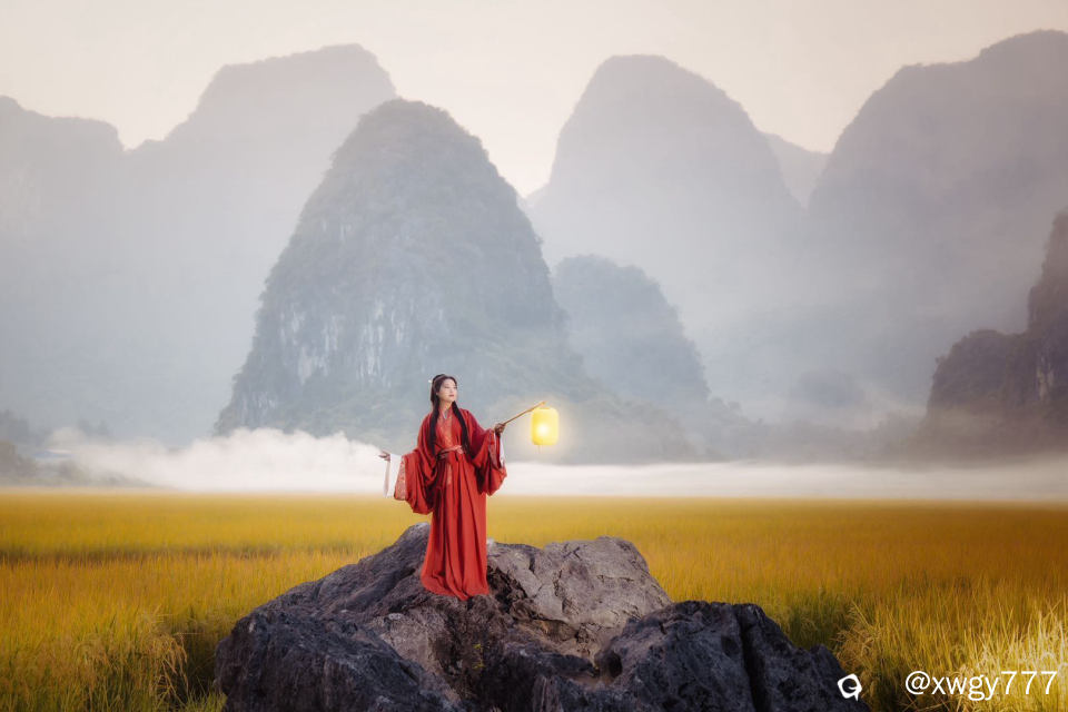 2024年十月拍的一组战国袍,原本是想拍状元桥日出的,谁知道那天刚好遇到临桂区在拍状元桥的宣传片,一直没机会上桥,就在旁边的稻田上拍起了,没想到这个大石头今年火了,还有了一个非常美丽的名字:禾韵田园