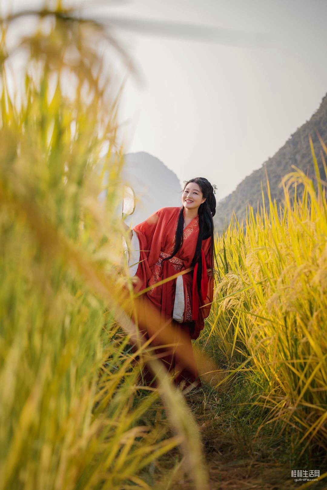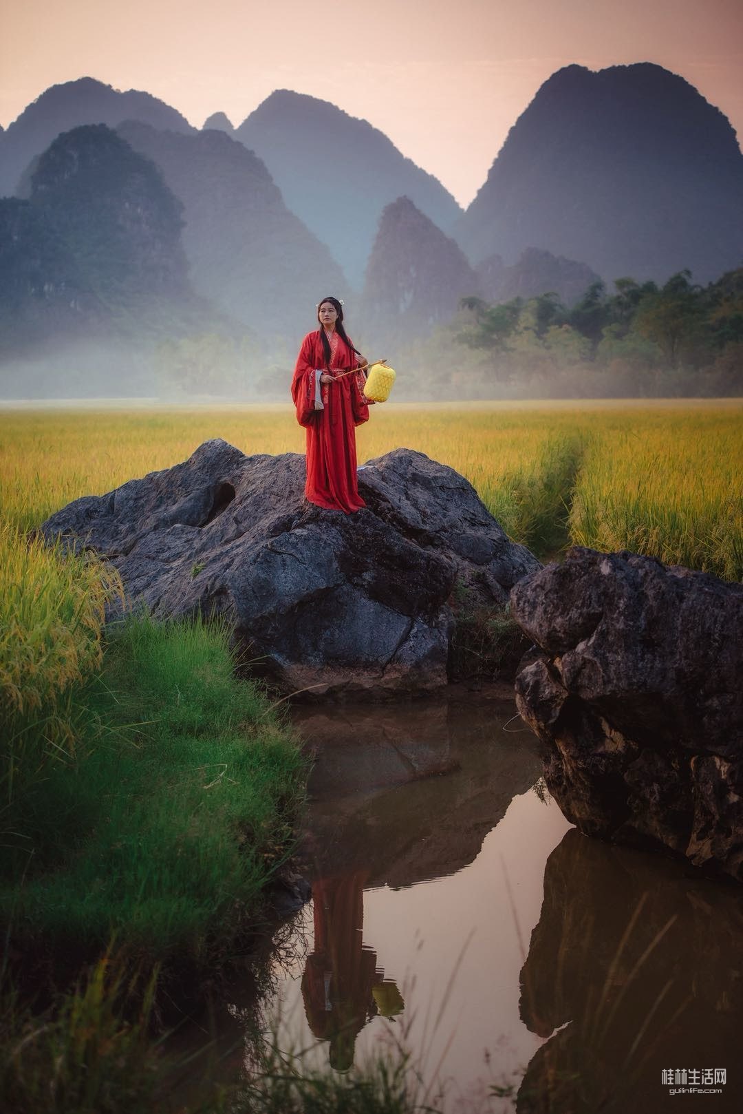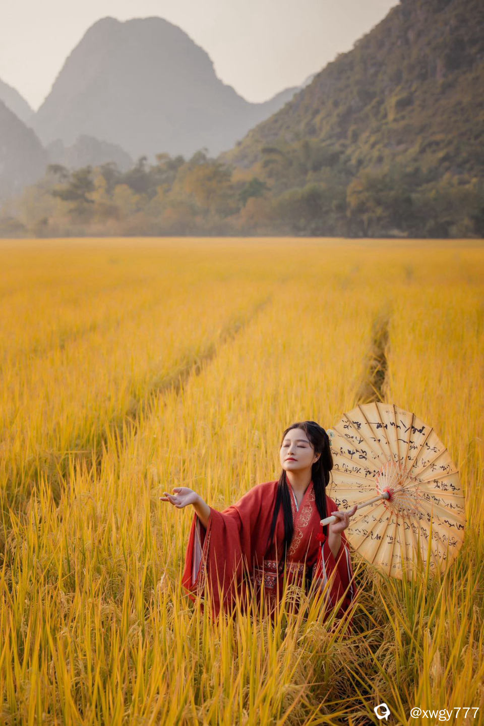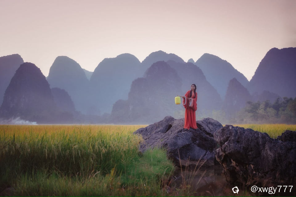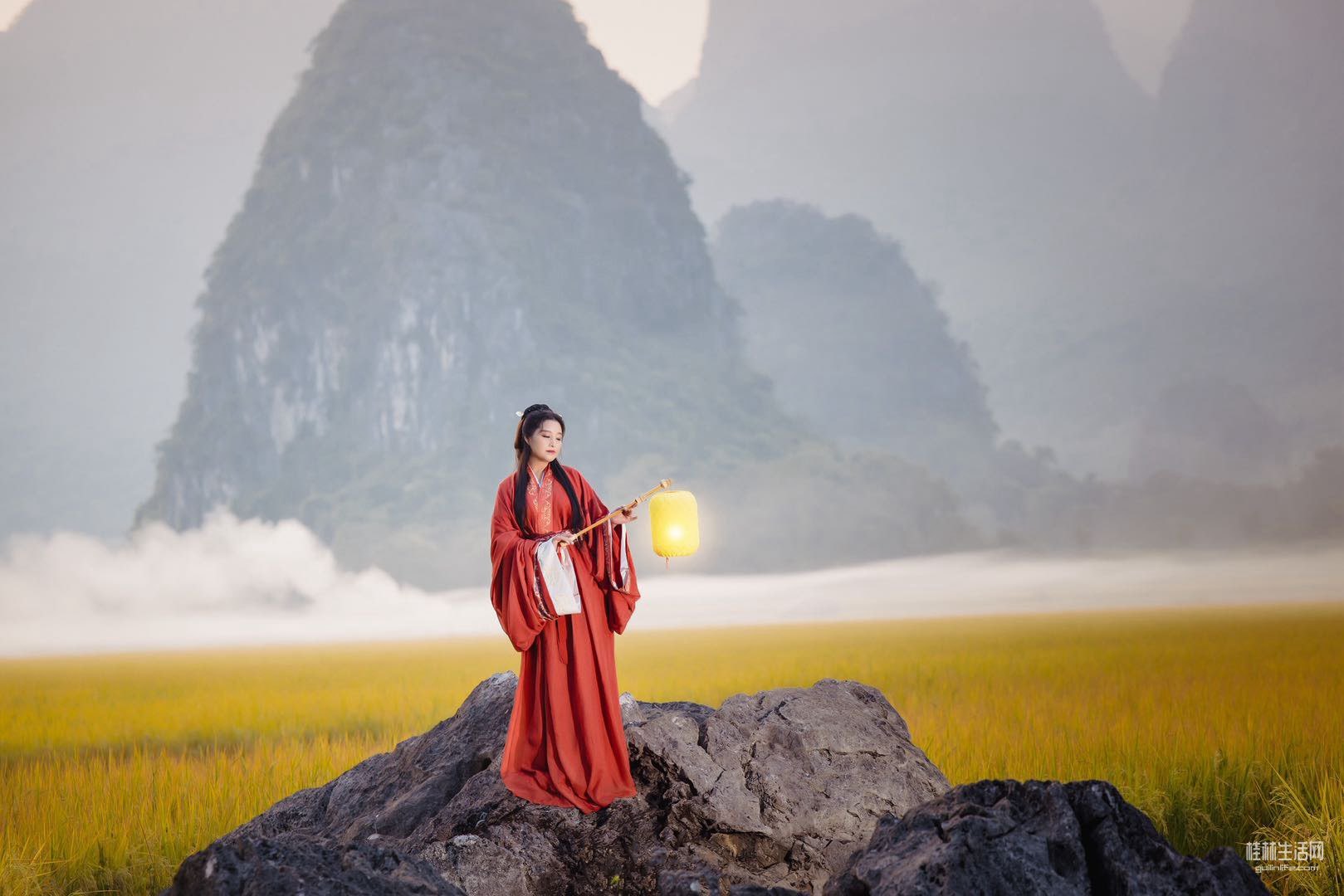 2024年十月拍的一组战国袍,原本是想拍状元桥日出的,谁知道那天刚好遇到临桂区在拍状元桥的宣传片,一直没机会上桥,就在旁边的稻田上拍起了,没想到这个大石头今年火了,还有了一个非常美丽的名字:禾韵田园