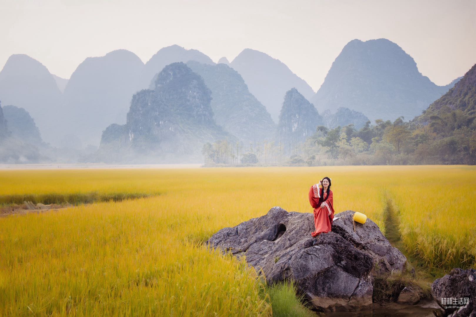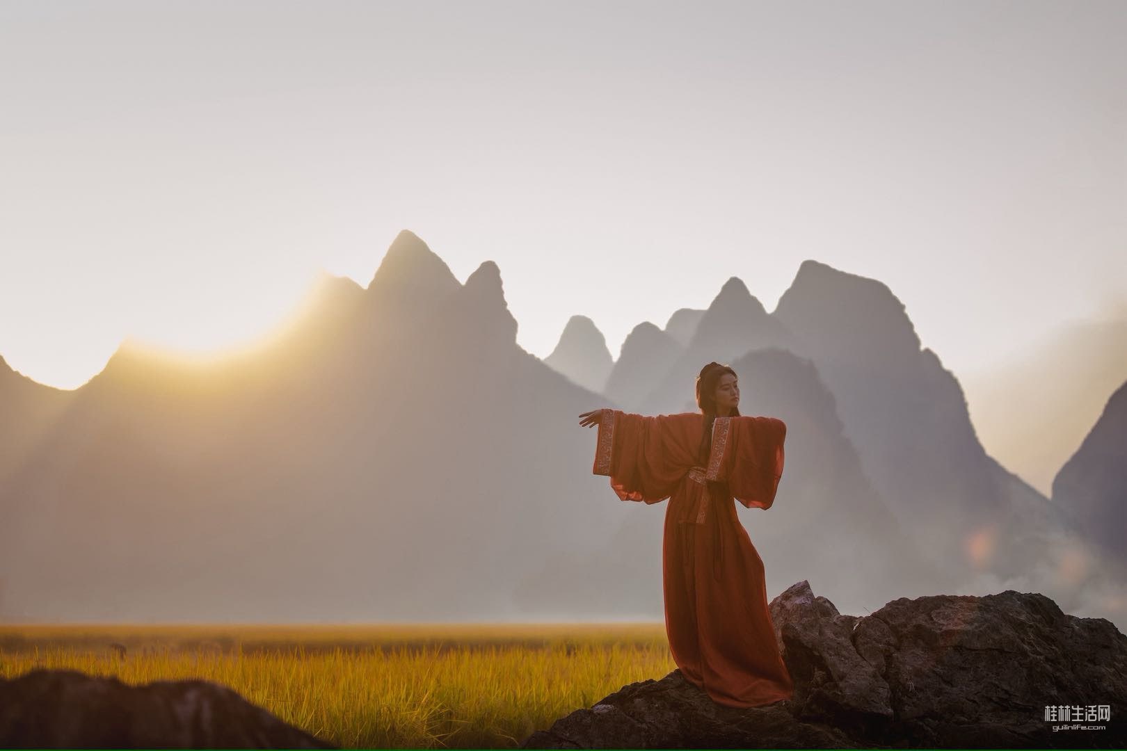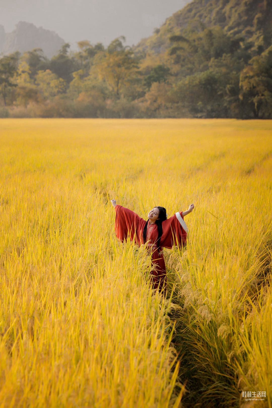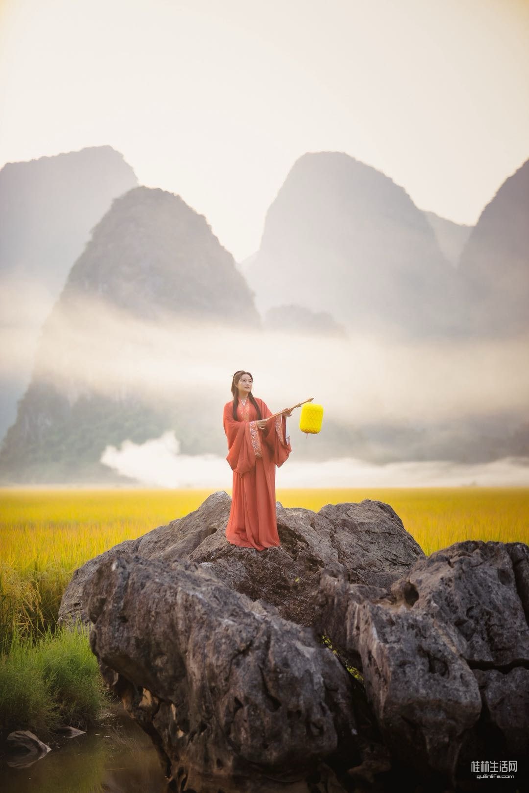 2024年十月拍的一组战国袍,原本是想拍状元桥日出的,谁知道那天刚好遇到临桂区在拍状元桥的宣传片,一直没机会上桥,就在旁边的稻田上拍起了,没想到这个大石头今年火了,还有了一个非常美丽的名字:禾韵田园
