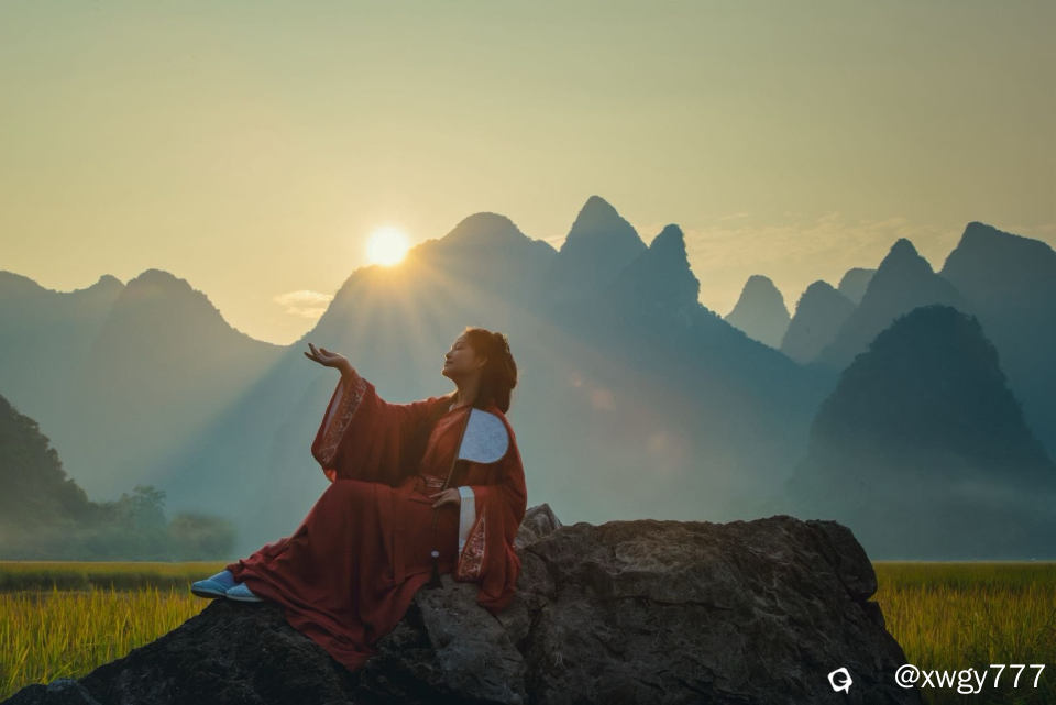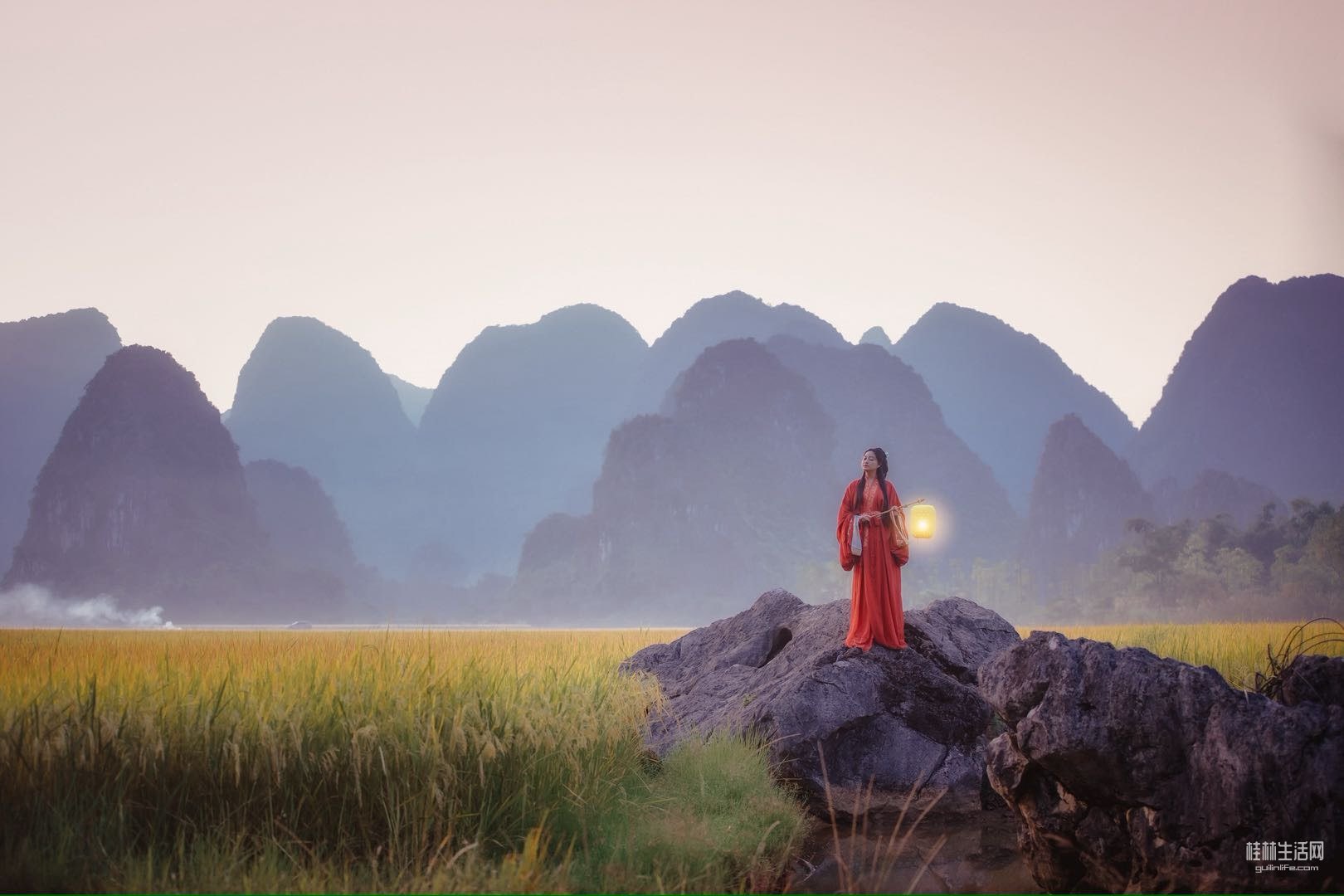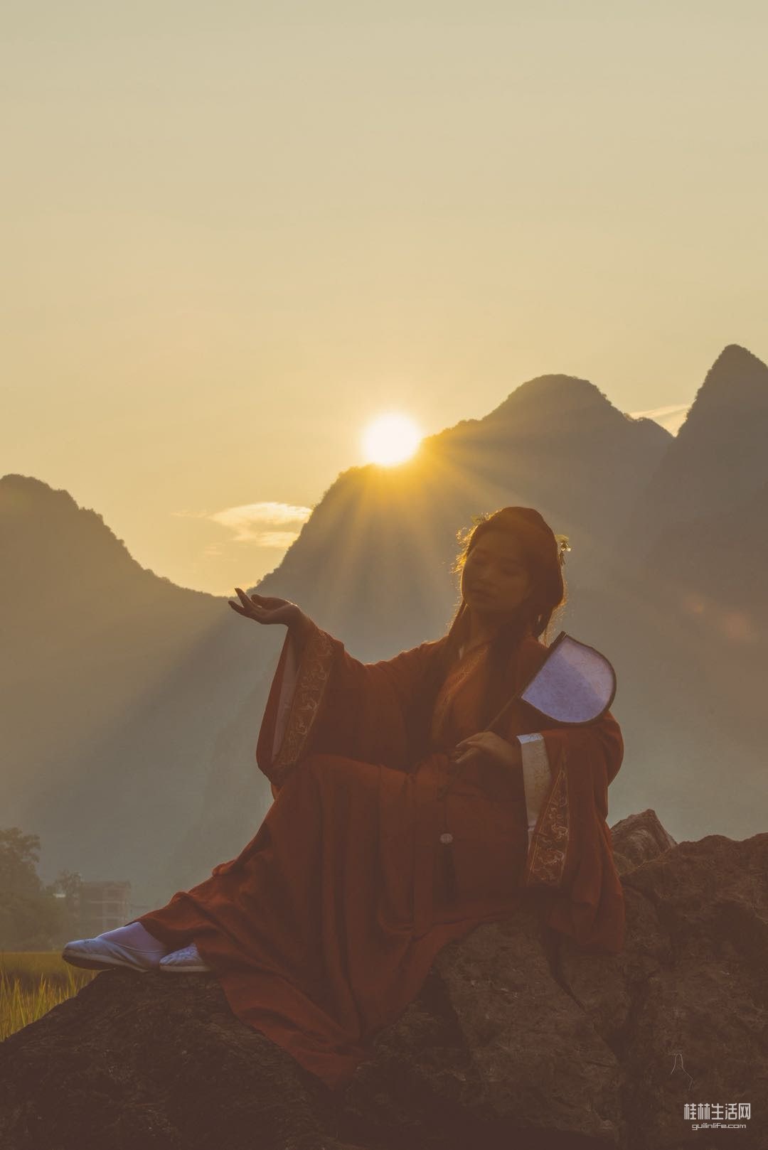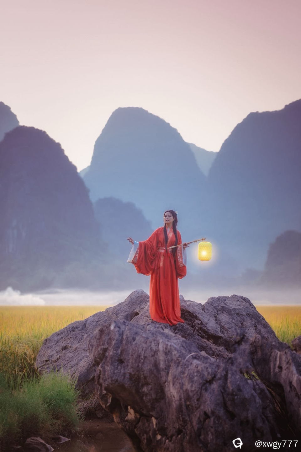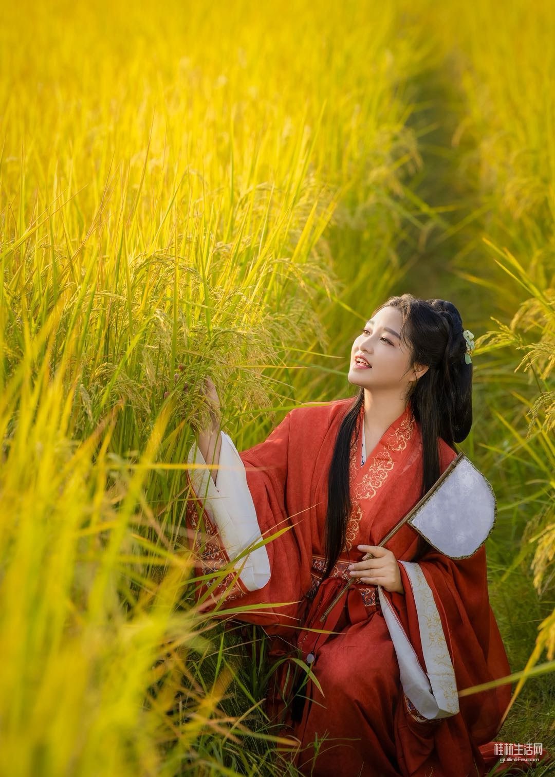 2024年十月拍的一组战国袍,原本是想拍状元桥日出的,谁知道那天刚好遇到临桂区在拍状元桥的宣传片,一直没机会上桥,就在旁边的稻田上拍起了,没想到这个大石头今年火了,还有了一个非常美丽的名字:禾韵田园