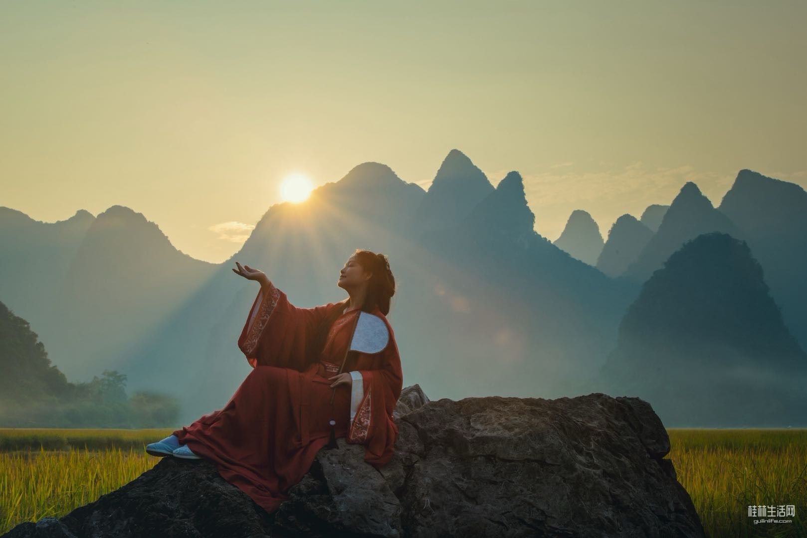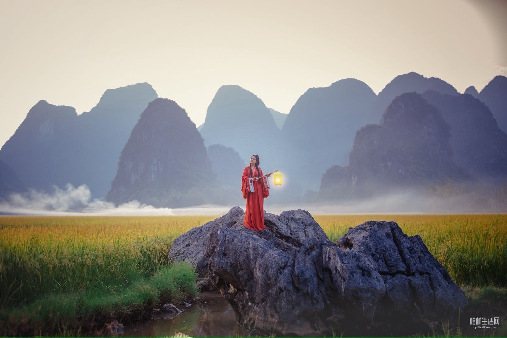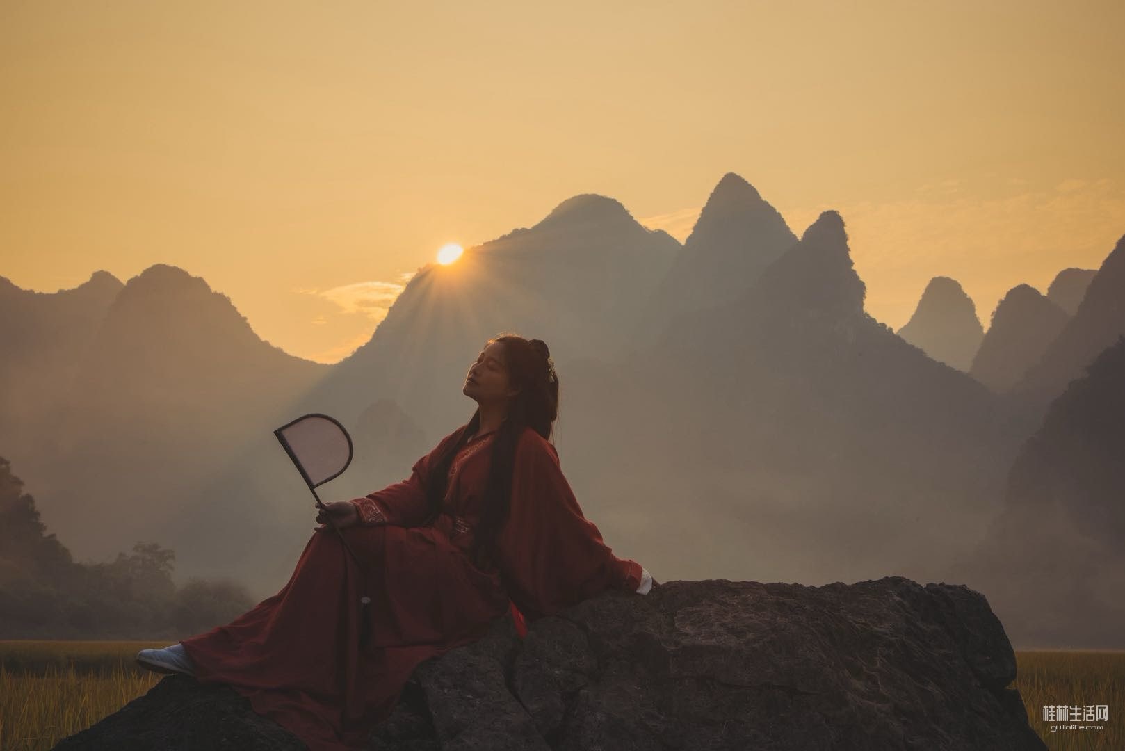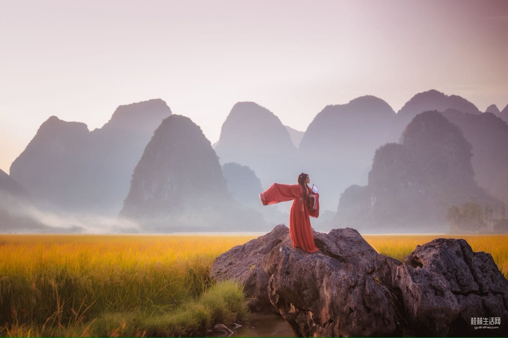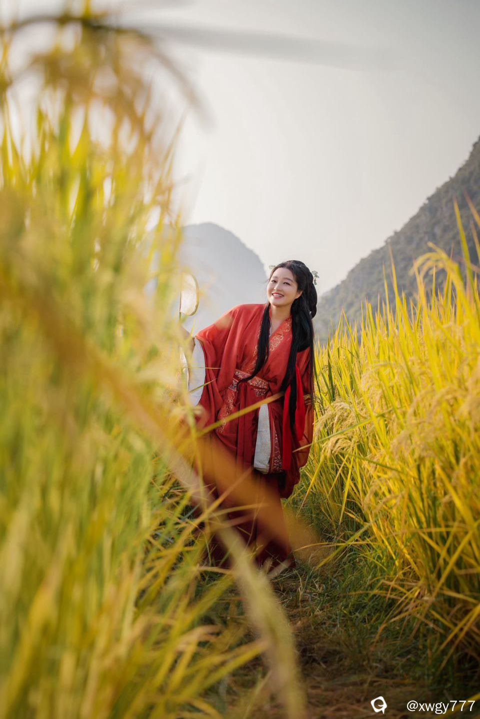 2024年十月拍的一组战国袍,原本是想拍状元桥日出的,谁知道那天刚好遇到临桂区在拍状元桥的宣传片,一直没机会上桥,就在旁边的稻田上拍起了,没想到这个大石头今年火了,还有了一个非常美丽的名字:禾韵田园