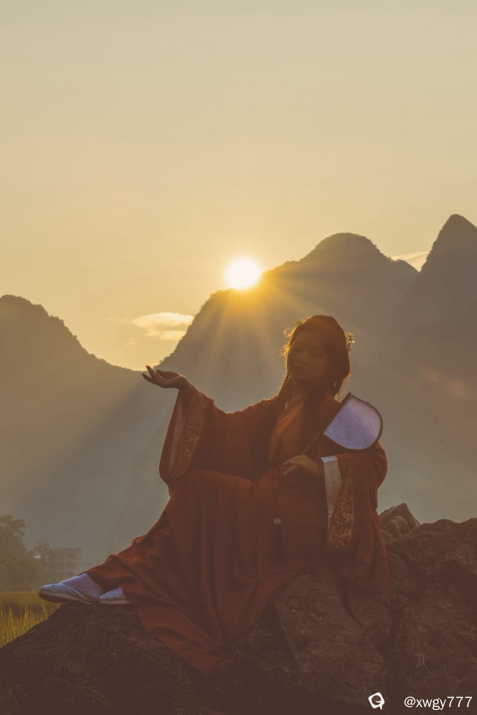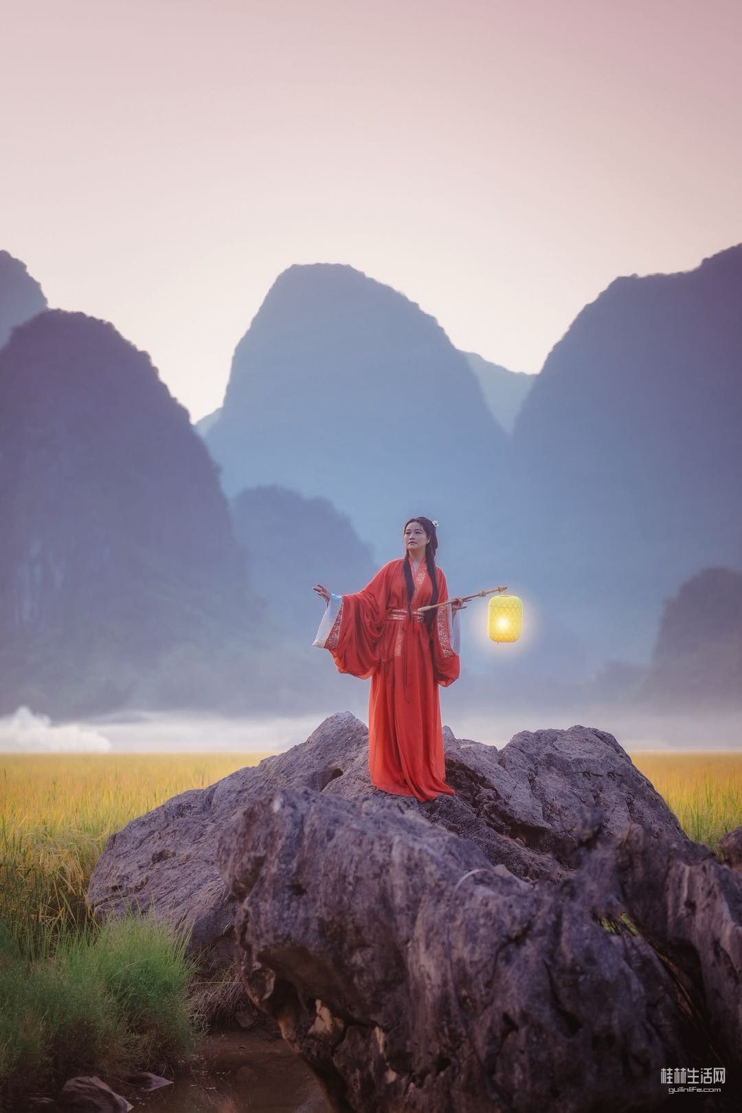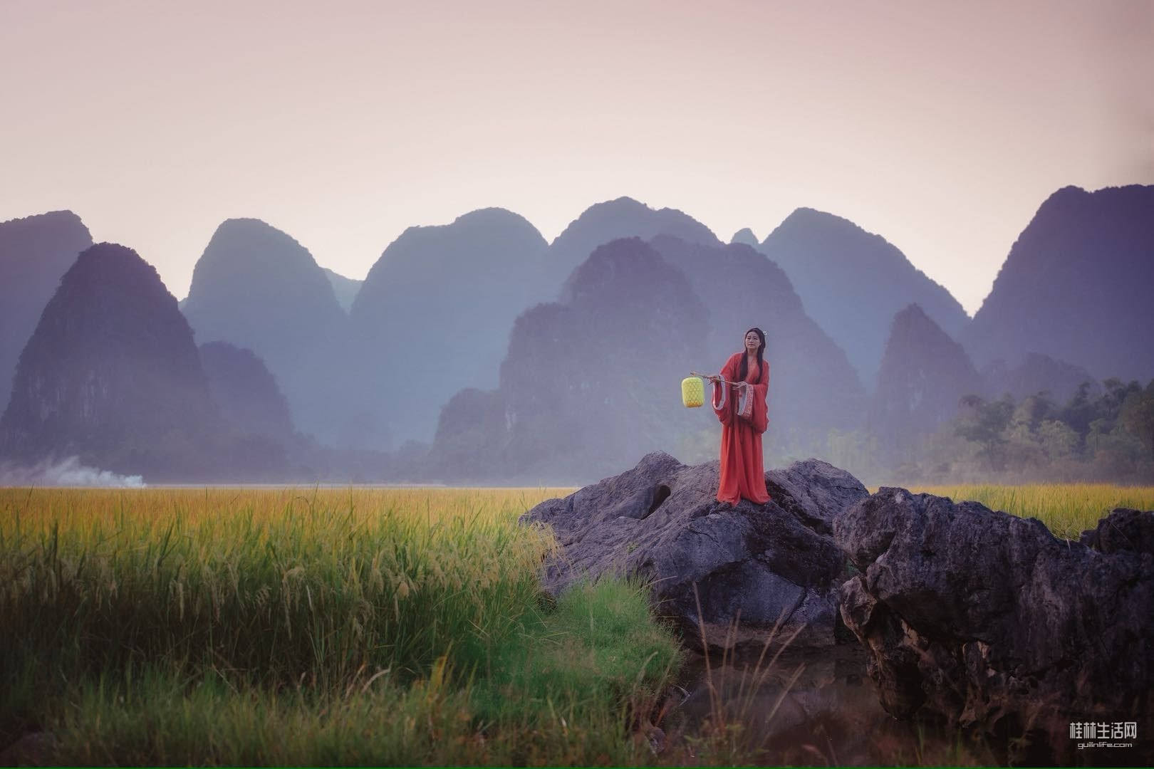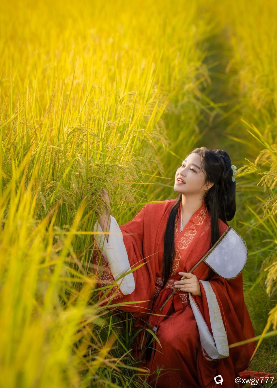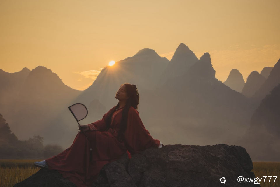2024年十月拍的一组战国袍,原本是想拍状元桥日出的,谁知道那天刚好遇到临桂区在拍状元桥的宣传片,一直没机会上桥,就在旁边的稻田上拍起了,没想到这个大石头今年火了,还有了一个非常美丽的名字:禾韵田园