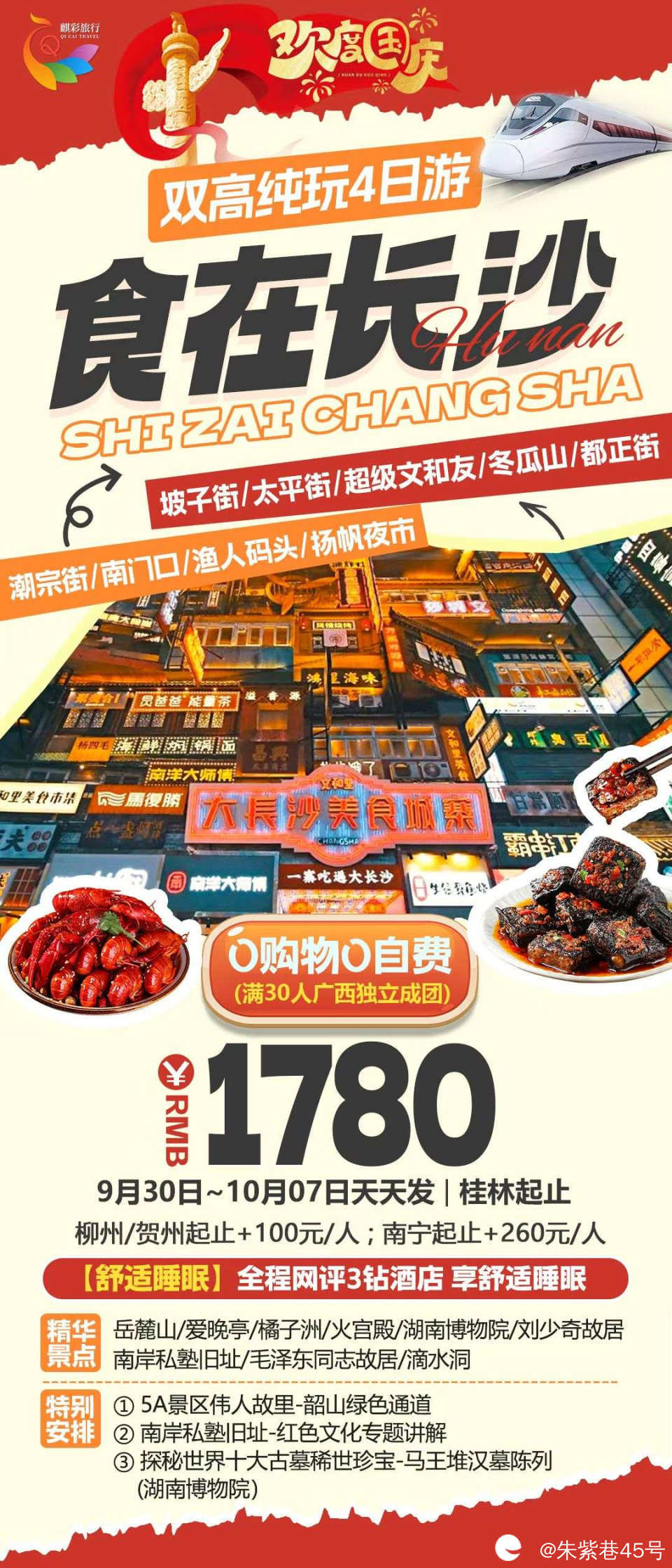 国庆-高铁长沙4天9月30日-10月7日天天发
