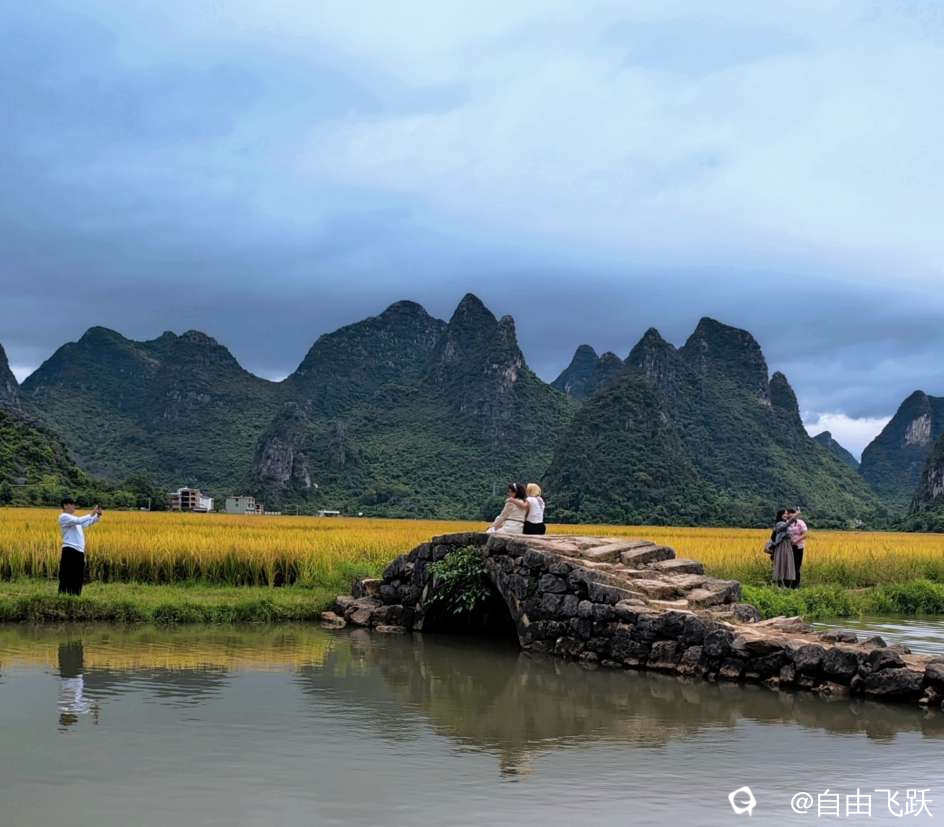 来过好多次状元桥,看过好多次这块黑蛐蛐的卧牛石了,以前从来没有想过它居然会火,这块普通石头如果不是正好卧在田心村状元桥旁边,正好遇到状元桥的稻谷熟了,又正好大模爬上去照出好多美美照,它怎么会火?