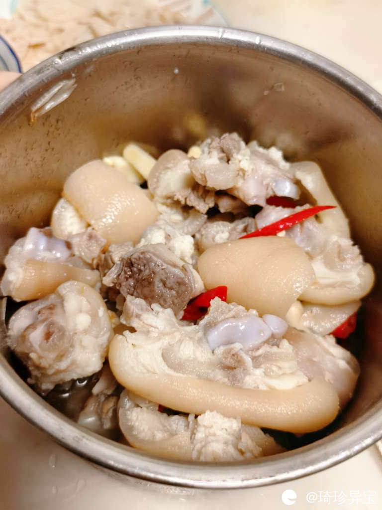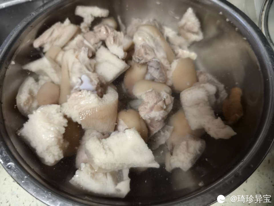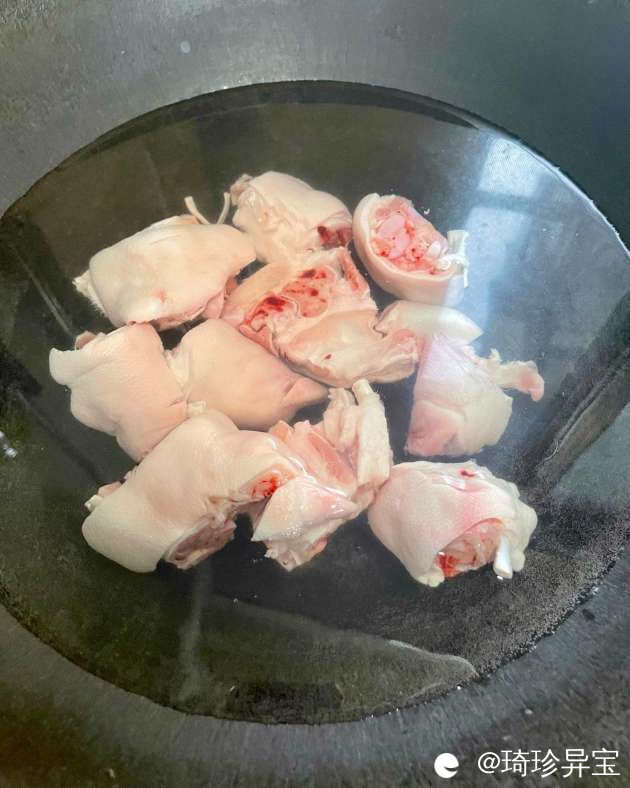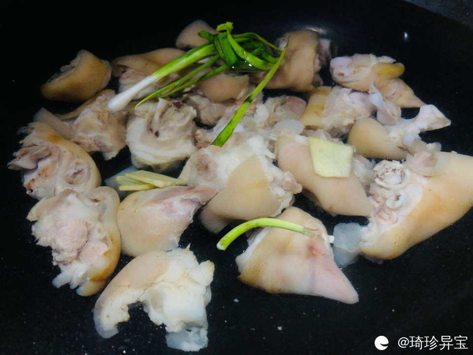 1,新鲜的猪脚,最好是前脚,买回来砍好,(不要太肥的)冷水下锅焯水,锅里面放料酒和生姜。
