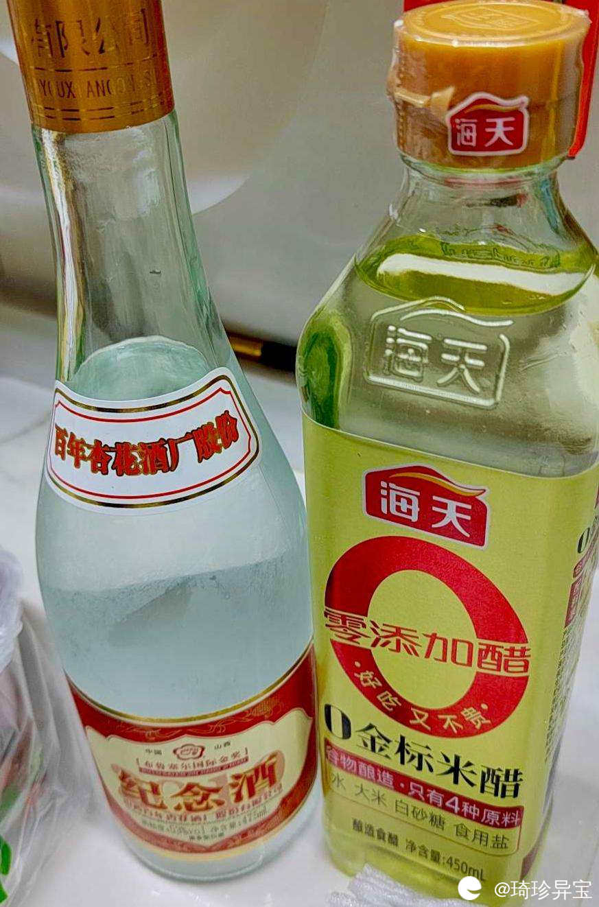 4,调糖醋汁,比例是一斤醋放半斤白糖再放一两盐,里面放生仔姜切片还有不辣的红辣椒去籽切片。