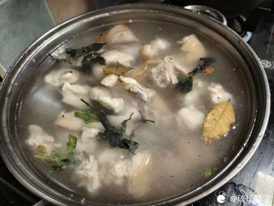 2 ,起锅炒一下香料,我用的是罗勒,紫苏,姜,葱花,香叶。然后加水,少量的白醋,把猪脚倒进去煮40分钟左右。