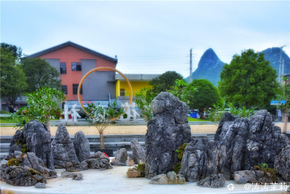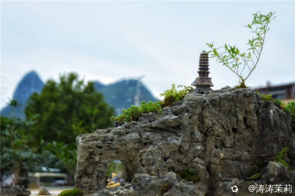 骆驼山和穿山在这一盆景里同时呈现,仿佛让人置身于微缩的桂林美景之中。
