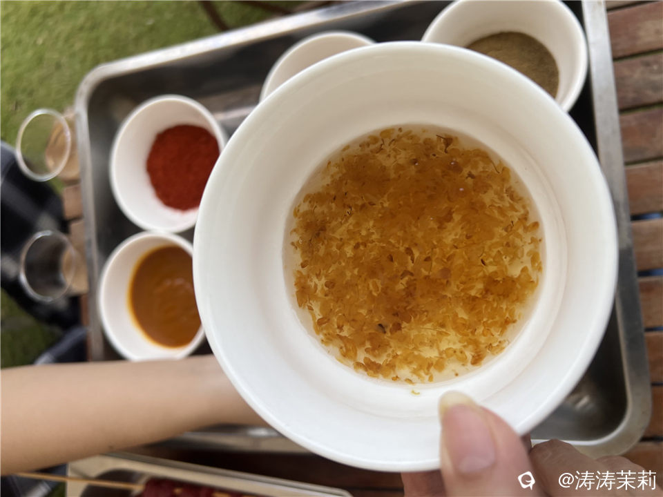 各式烧烤酱料中,最爱这一口桂花酱的香气,桂花香的烧烤,每一口都是被香气包裹的秋日限定美味,真的超好吃。