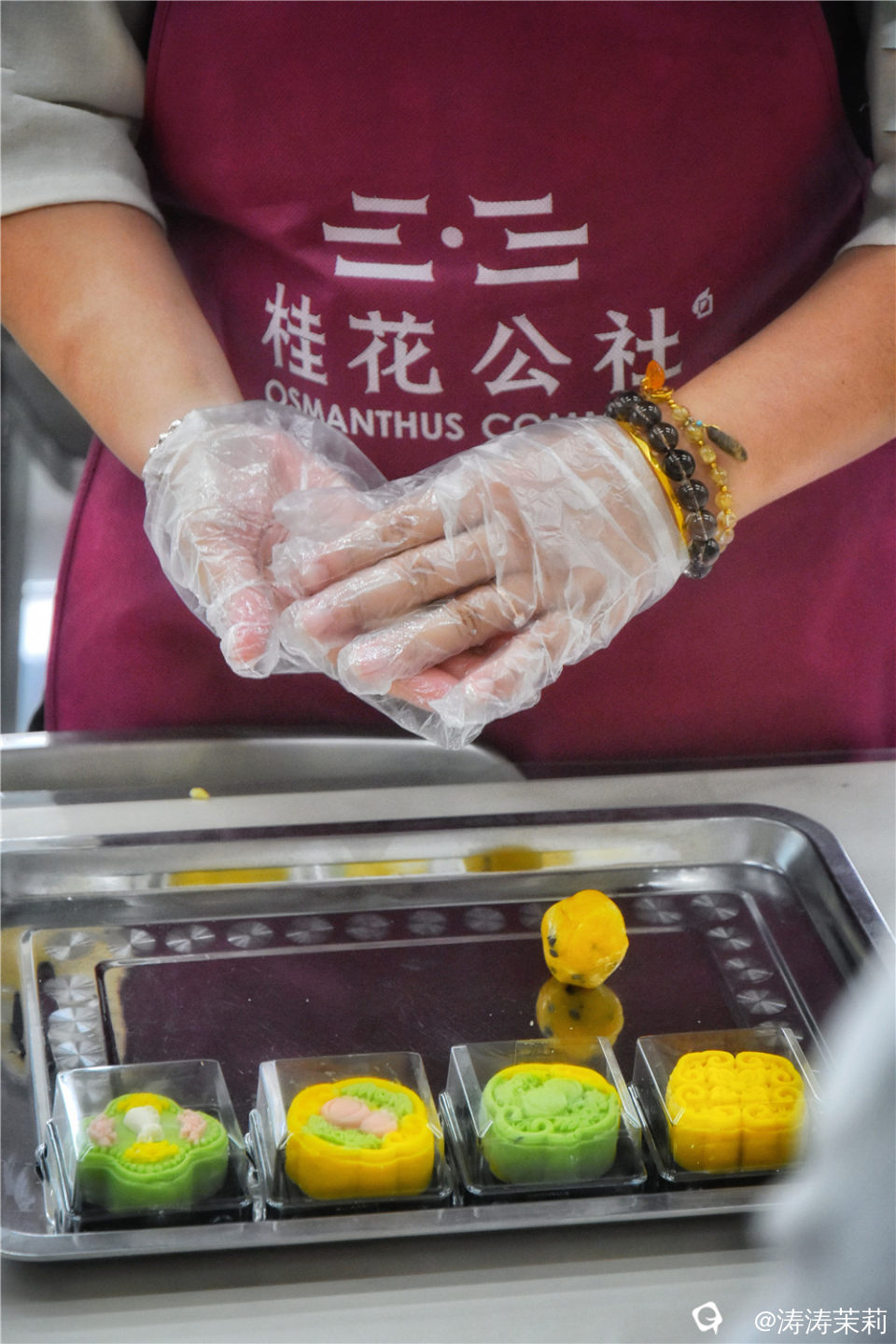 在桂花非遗手工馆DIY月饼,桃山皮的饼皮和上特制的桂花百香果馅料,感受自己动手做美食的乐趣,重点是真的甜而不腻太好吃了吧!
