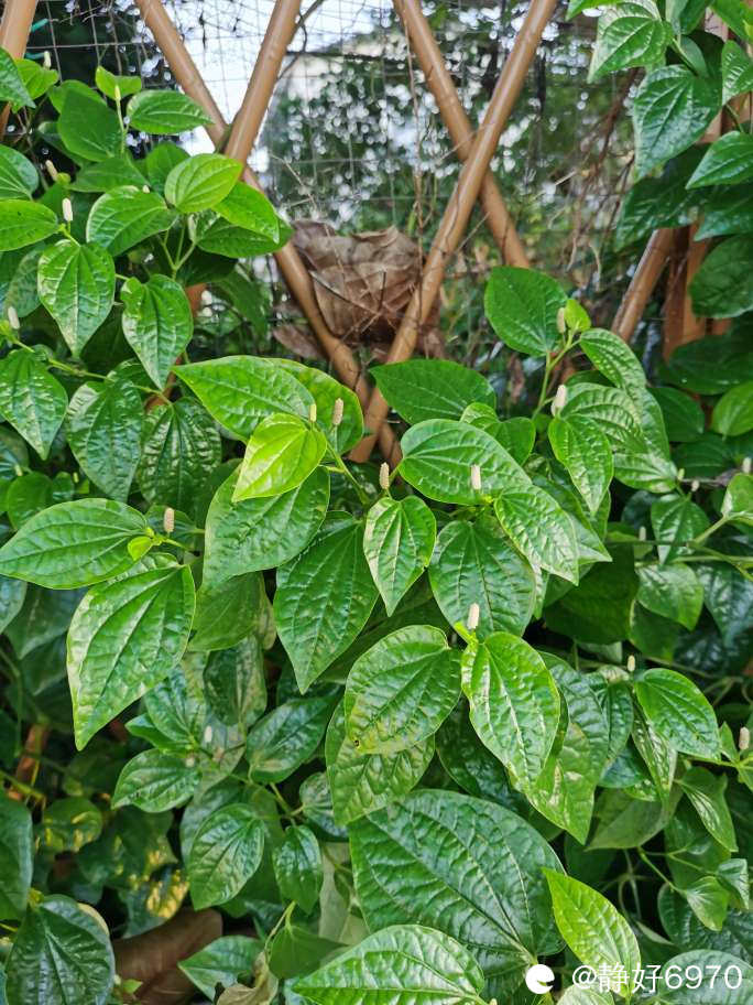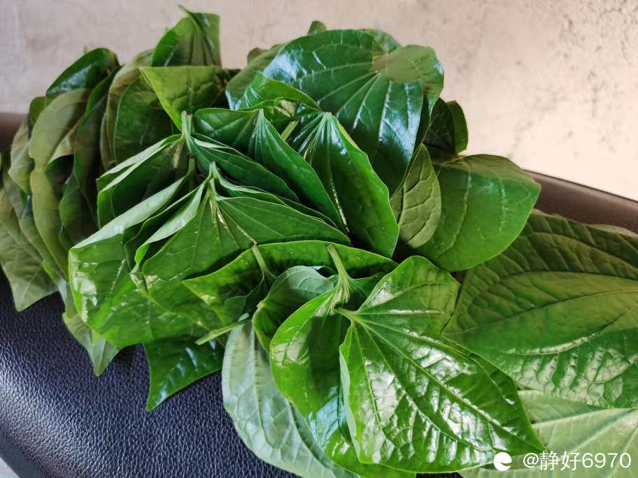 下图是假蒌叶,用来包五花肉的,这植物随便找,到处都是,可以用来炒田螺,去腥味,还可以用来煮汤、煮粥,由于它性温,用来中和勒古叶的寒性。