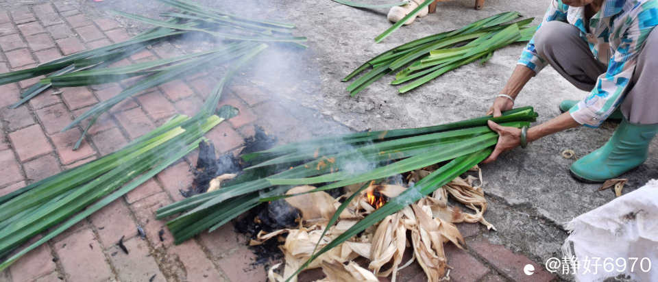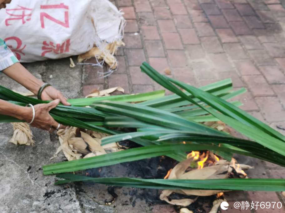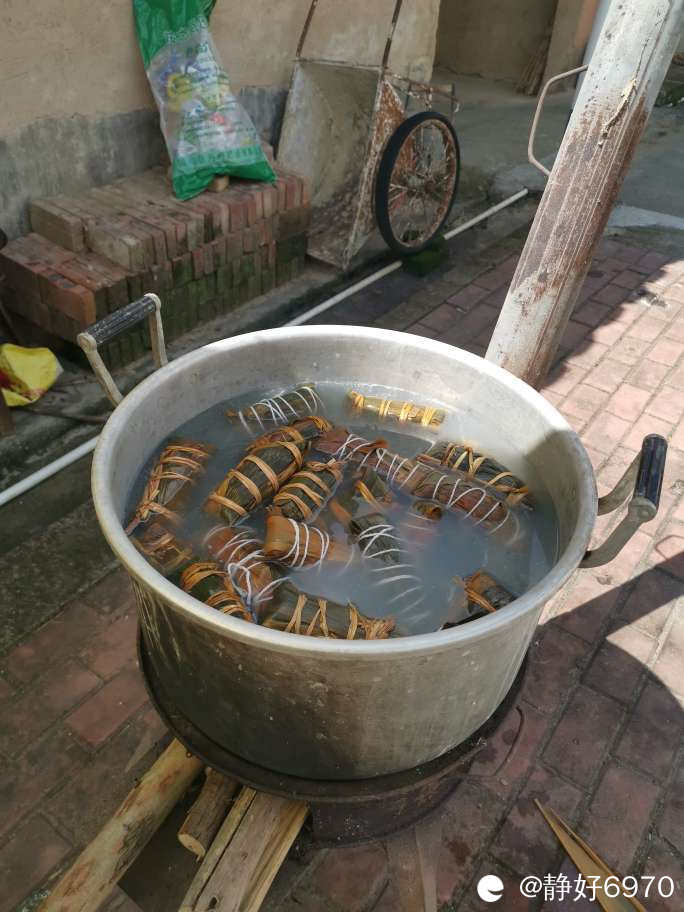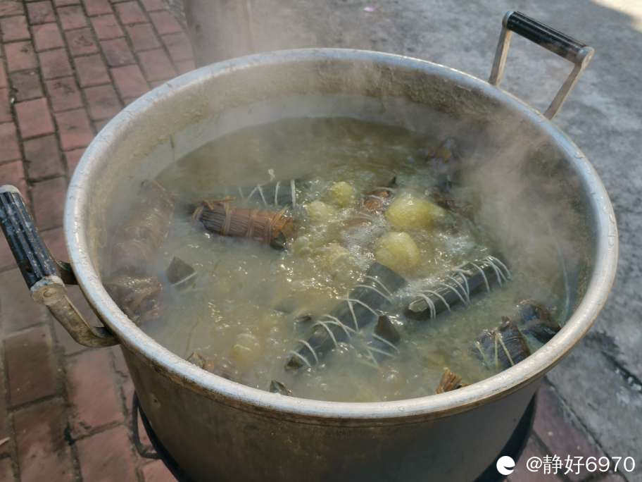 最后一道工序,需要耗时8个小时。那就是用柴火煮粽子。邻居婶婶把平时不用的铁灶给搬出来。