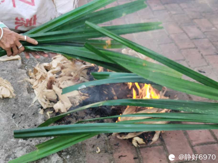 邻居婶婶提前一天就把碧绿的勒古叶割回来,用小刀小心地削去叶子上的小尖刺,如果天气好,时间允许的条件下,修理后的勒古叶放在阳光下晒半天就干了,由于是下午才去割的勒古叶,他们只好用火烤软。