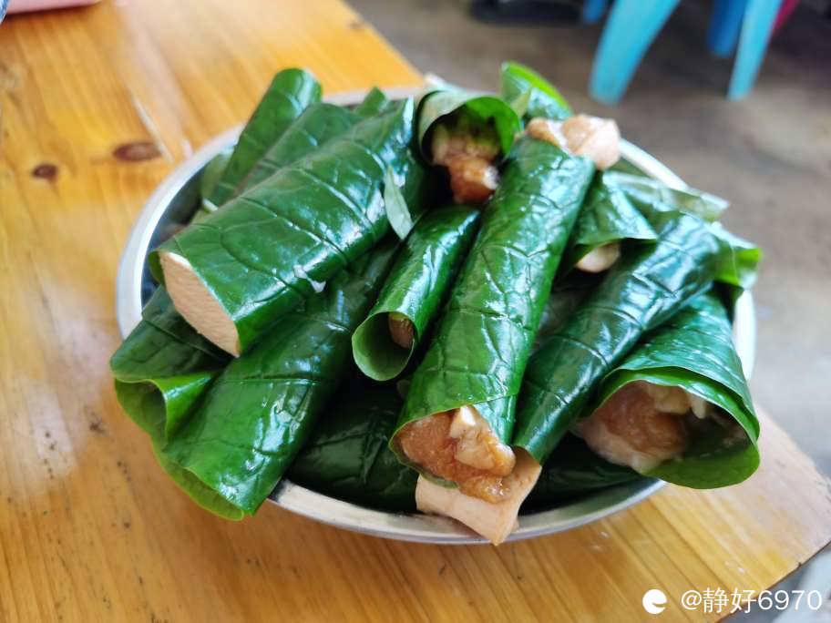 再用假蒌叶包裹五花肉,这一步至关重要,平衡勒古叶的寒性,增添独特香气。