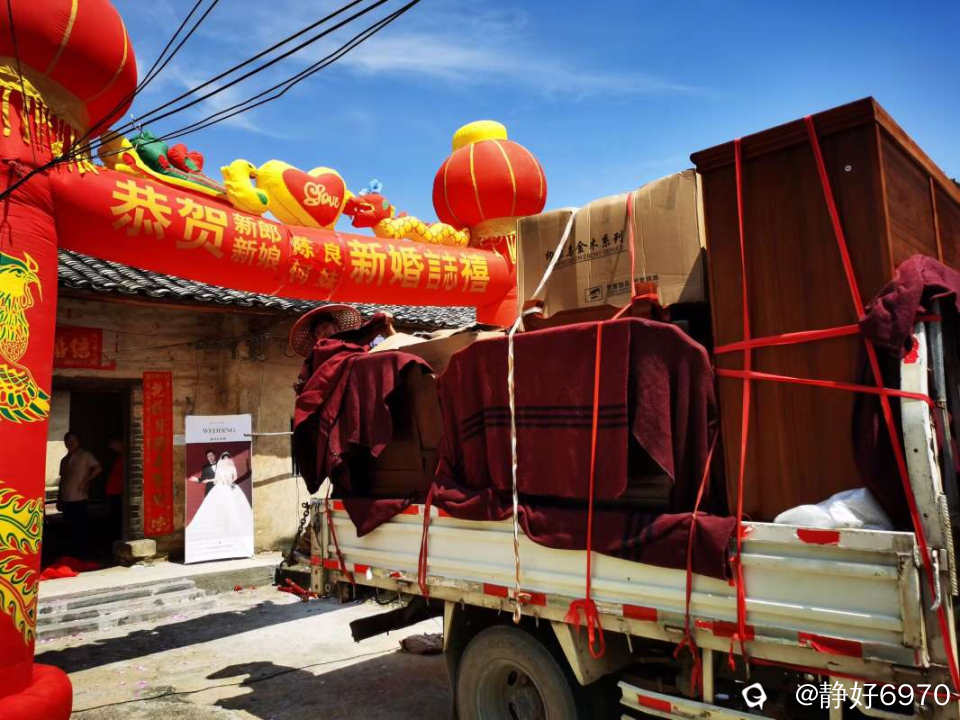 回头一看陪嫁装了两部拉货车,以前结婚都陪嫁棉被,盆,桶,等生活用品,记得看过一个农村人嫁女,陪了24床棉被,可见家里七大姑八大姨比较多,大家开玩笑说,这么多被子,开旅馆都够了。现在陪嫁家电,家具,车子,房子,票子,琳琅满目……