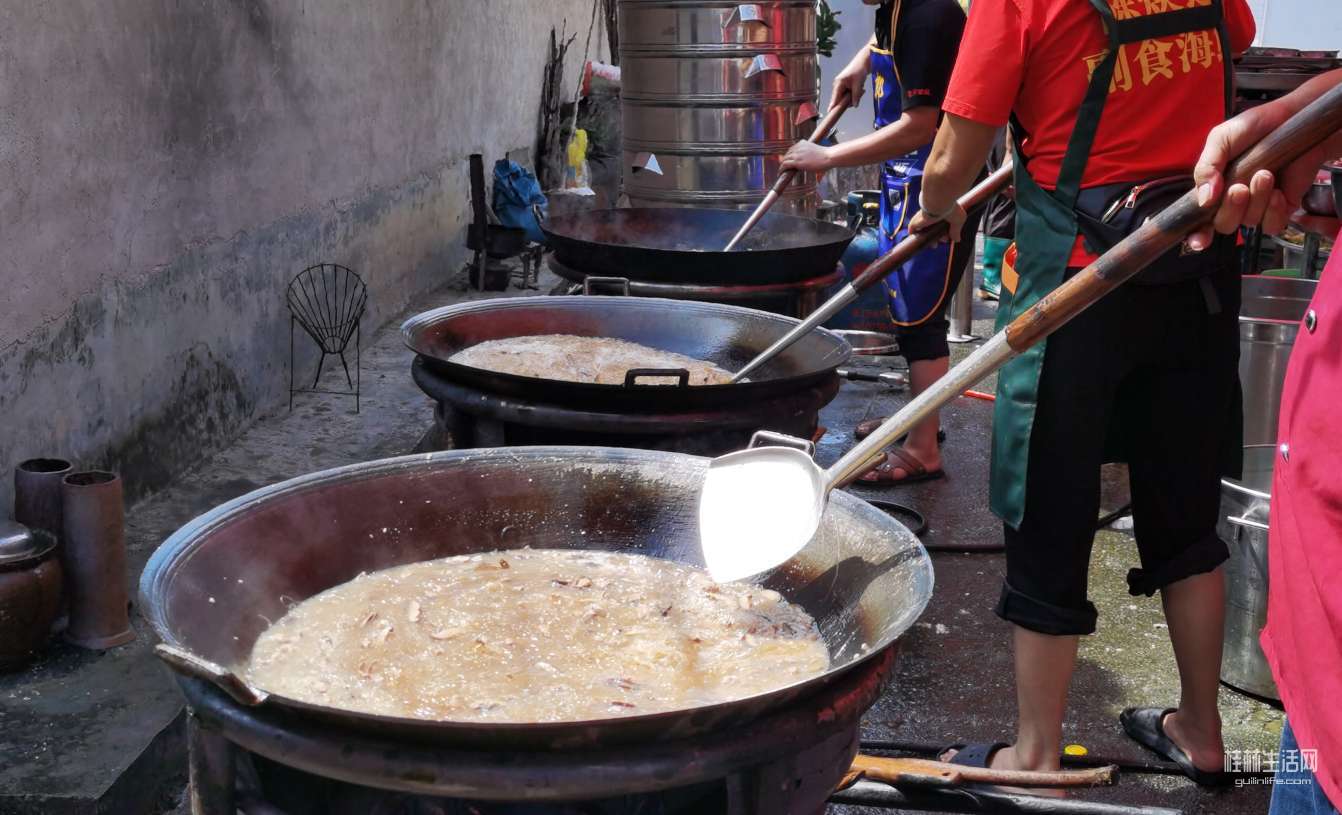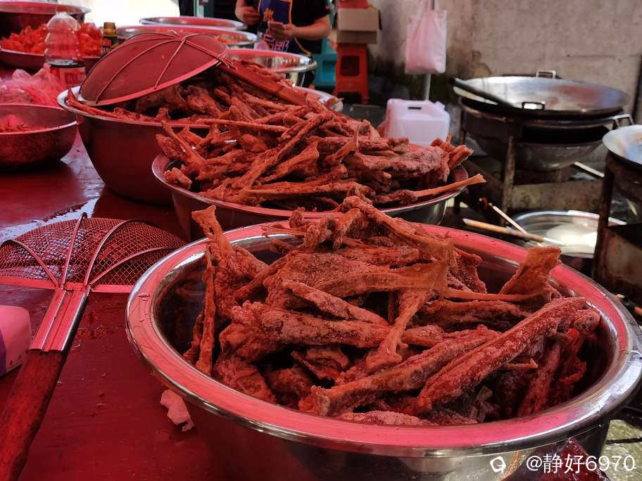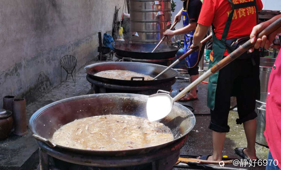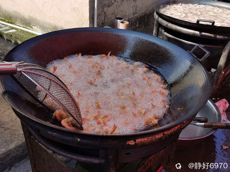 油炸现场三口大锅一字排开,油炸海虾,油炸扇骨,大厨们忙的热火朝天,锅铲翻炒声,油锅炸物声,案板剁肉声,就像没谱的交响乐,却格外亲切。