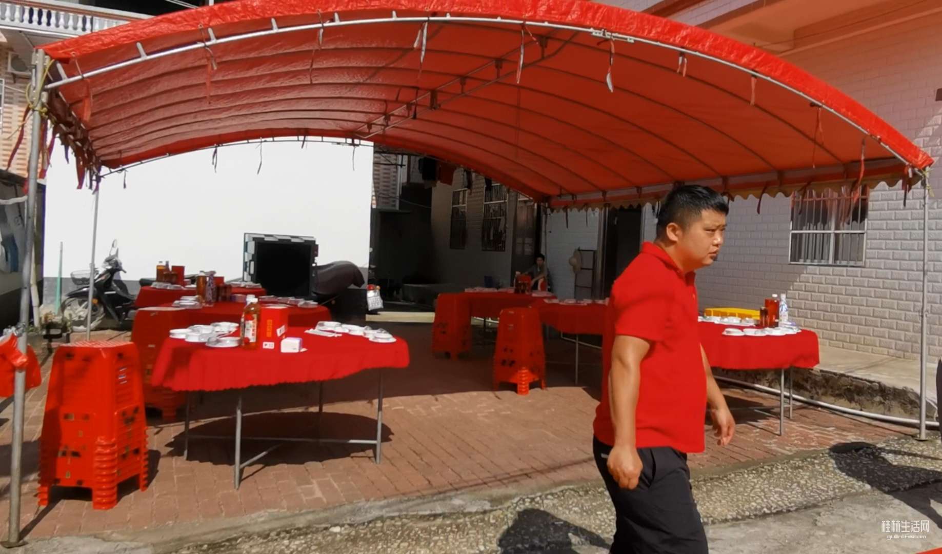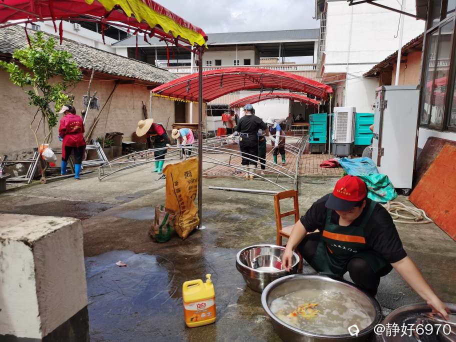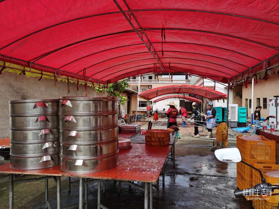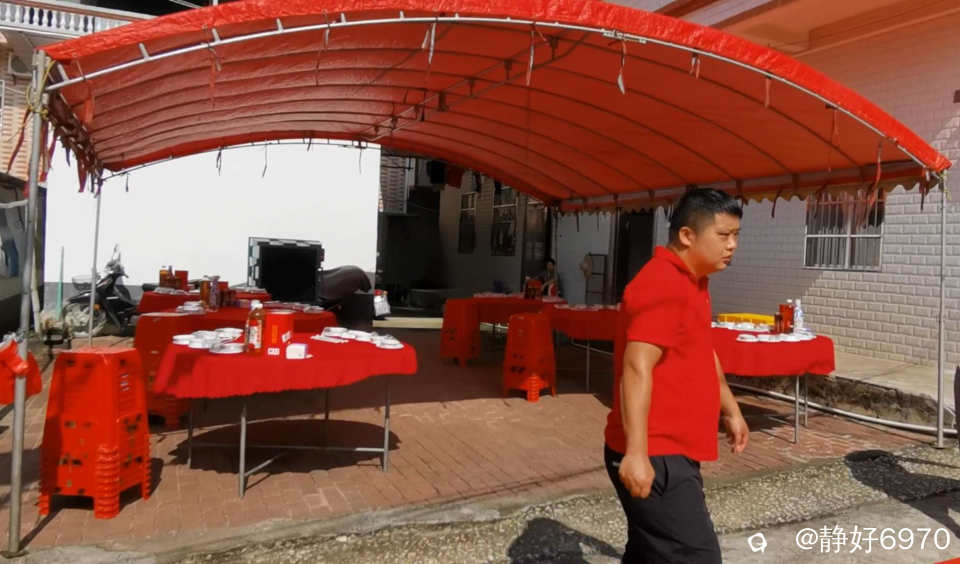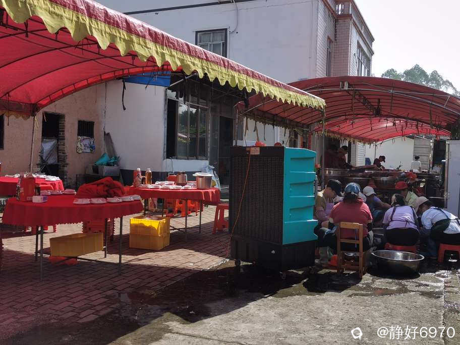 在农村办红白喜事,不像城里人到饭店酒楼去包几桌酒席,而是在自家的院子里搭起棚子,垒起灶台,请几个乡厨,自己做酒席来宴请所有的亲朋好友。现在农村有“一条龙”服务。提前一天就把棚子搭好,锅灶,蒸笼,排风扇全部到位。场地不够,邻居家的院子,晒谷场上也支起大圆桌,红布一铺,瓷碗一摆,热闹得连风都绕着走。以下是搭架子现场。