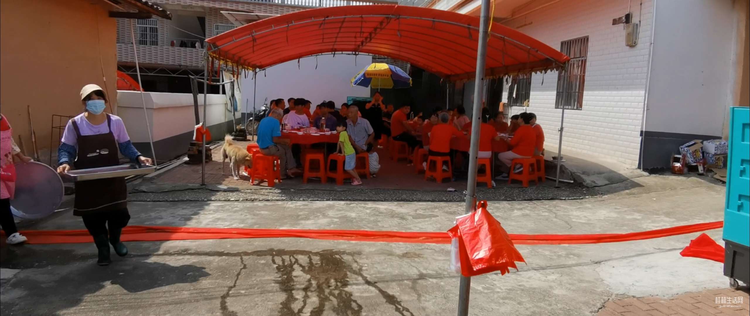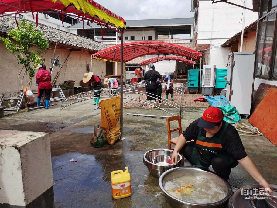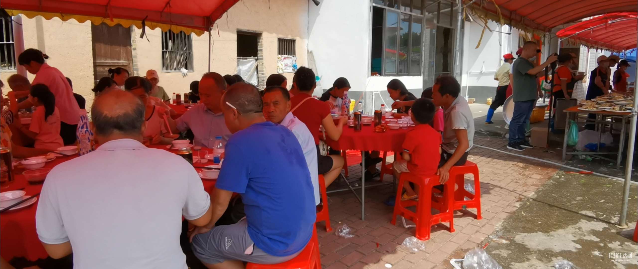 在农村办红白喜事,不像城里人到饭店酒楼去包几桌酒席,而是在自家的院子里搭起棚子,垒起灶台,请几个乡厨,自己做酒席来宴请所有的亲朋好友。现在农村有“一条龙”服务。提前一天就把棚子搭好,锅灶,蒸笼,排风扇全部到位。场地不够,邻居家的院子,晒谷场上也支起大圆桌,红布一铺,瓷碗一摆,热闹得连风都绕着走。以下是搭架子现场。