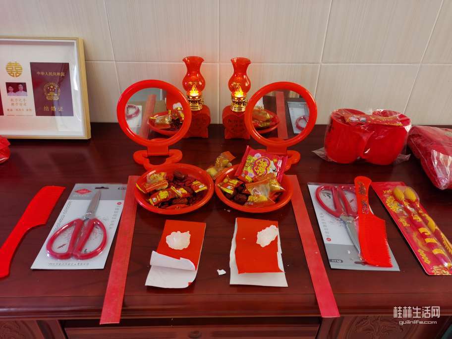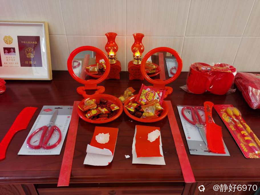 再拜高堂,接受父母的祝福!只见新人桌上摆了“婚庆九宝”,有红色镜子,梳子,毛巾,牙刷,剪刀,尺子,冰糖……寓意甜甜蜜蜜,子孙满堂。尺子也叫子孙尺,作为传统婚嫁习俗,寓意婚姻幸福源远流长,生活步步高升。