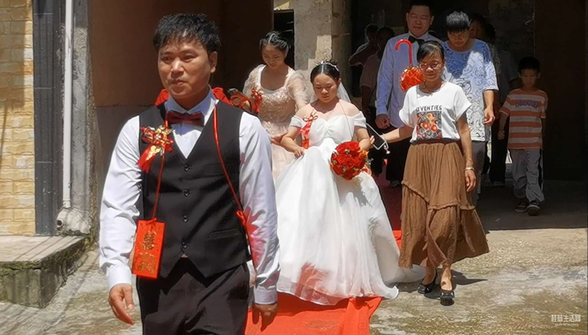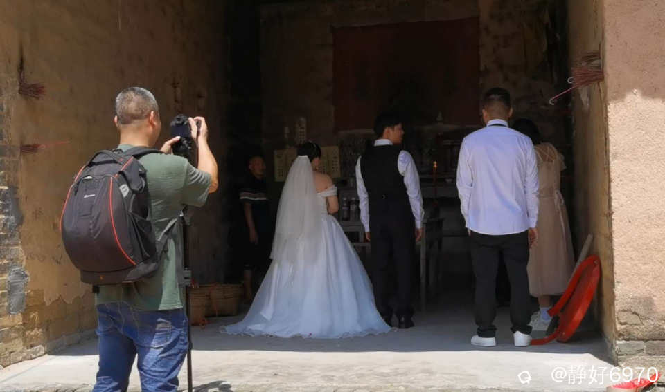 跟着新娘队伍踏着百年好合红地毯,首先来到祠堂,农村的风俗,凡遇大事,先去祭拜老祖宗,也就是敬祖祈福!这种习俗既是对先人养育之恩的回馈,也寄托了对家族兴旺的祈愿。