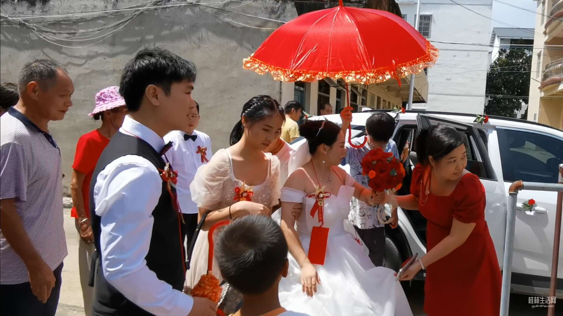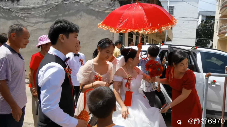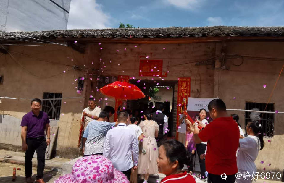 临近中午,一阵鞭炮声响起,新娘子来了,大家赶紧跑到农家院子大门等着,只见身穿白色礼服的新娘子,撑着红色的伞,在伴男伴女的陪伴下缓缓走过来,我本来站在一个最佳角度拍摄,但是抵挡不住乡亲们的热情,个个想一睹新娘子的芳容,把新娘子围的水泄不通,我只能拍个背影,有点小遗憾。