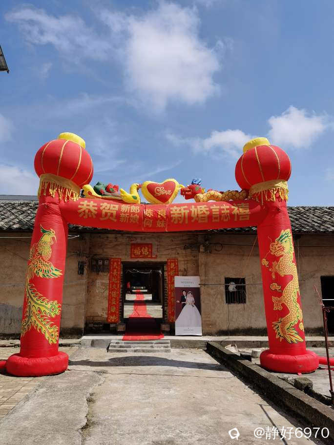 国庆节这天天气格外的好,蓝天白云衬托红色的龙凤呈祥气球,分外妖娆。喜庆的百年好合红色地毯直铺到家门口,仪式感顿时拉满,同时寓意“鸿运当头,一生走鸿运”!