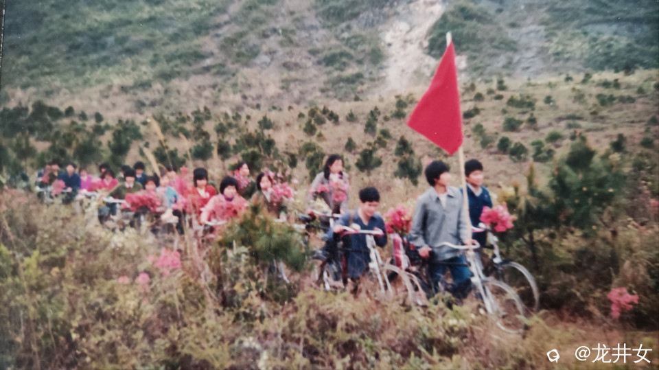 八十年代,班级春游,一人一车,队伍浩浩荡荡,车上的杜鹃花格外耀眼。